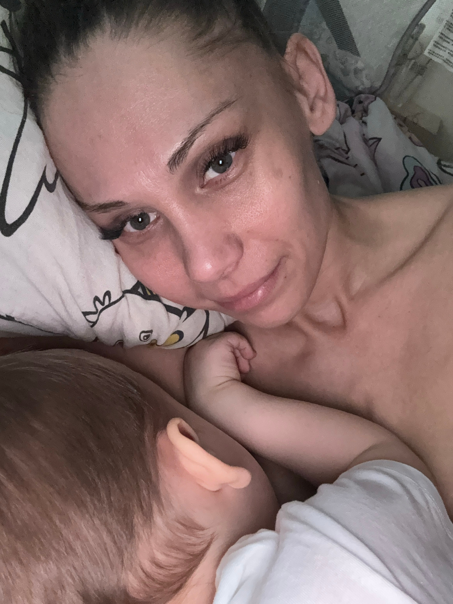 A close-up, slightly angled shot shows a woman lying in bed next to a baby. The woman is fair-skinned with dark hair pulled back, and she is looking at the camera with a slight smile. The baby, presumβ¦read more