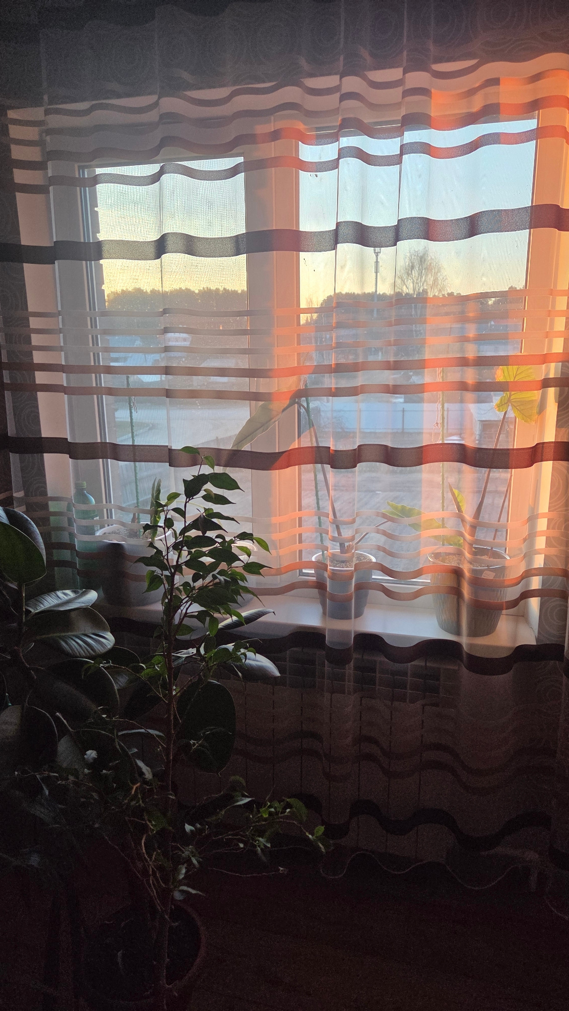 The image captures an indoor window scene bathed in the warm, golden light of what appears to be late afternoon or early morning. Sunlight streams through sheer, striped curtains that feature alternat…read more