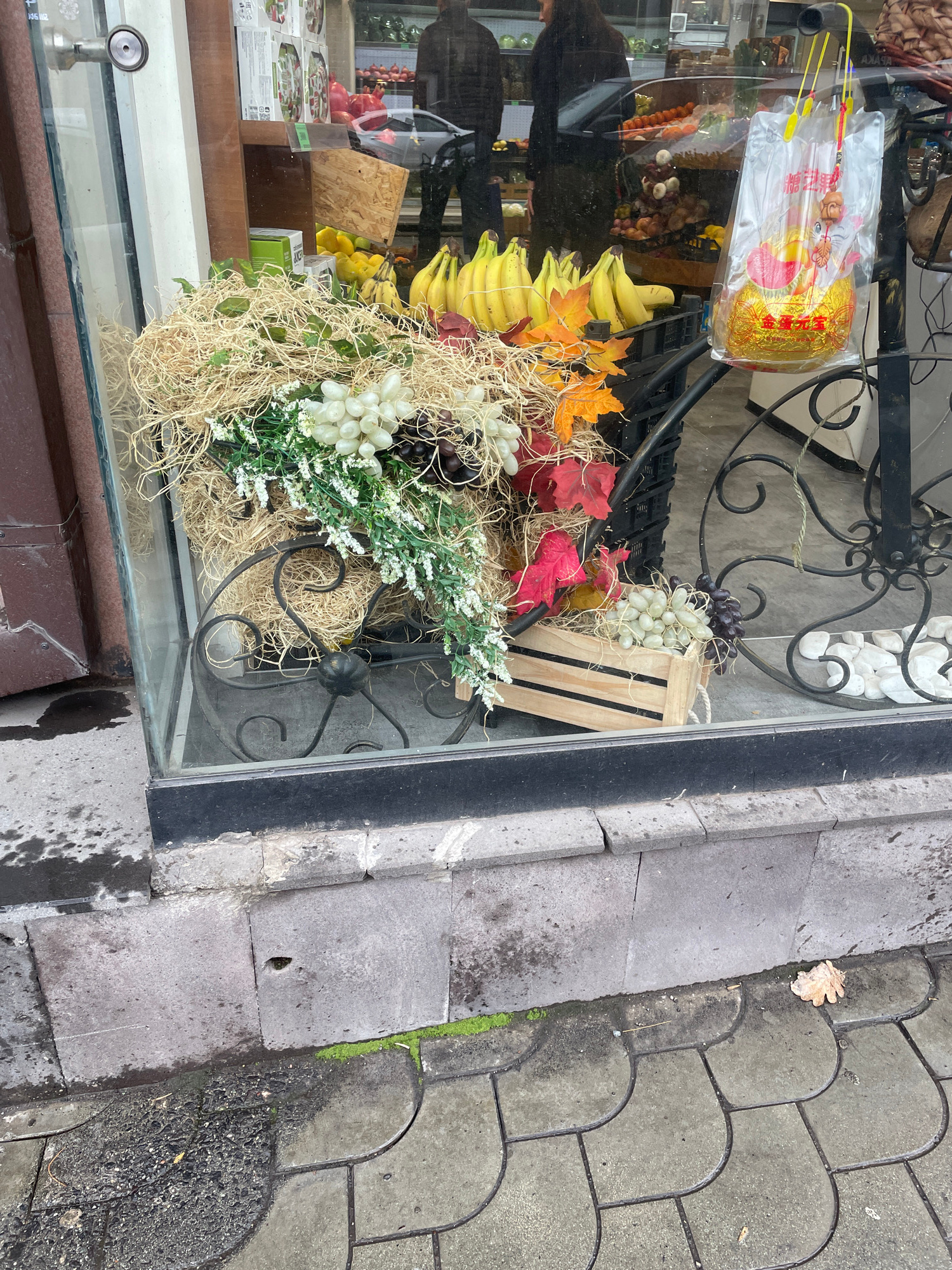 The image displays a street-level view of a storefront window display for a produce market or grocery store located in Yerevan, Armenia. The display features a central arrangement of light-brown straw…read more
