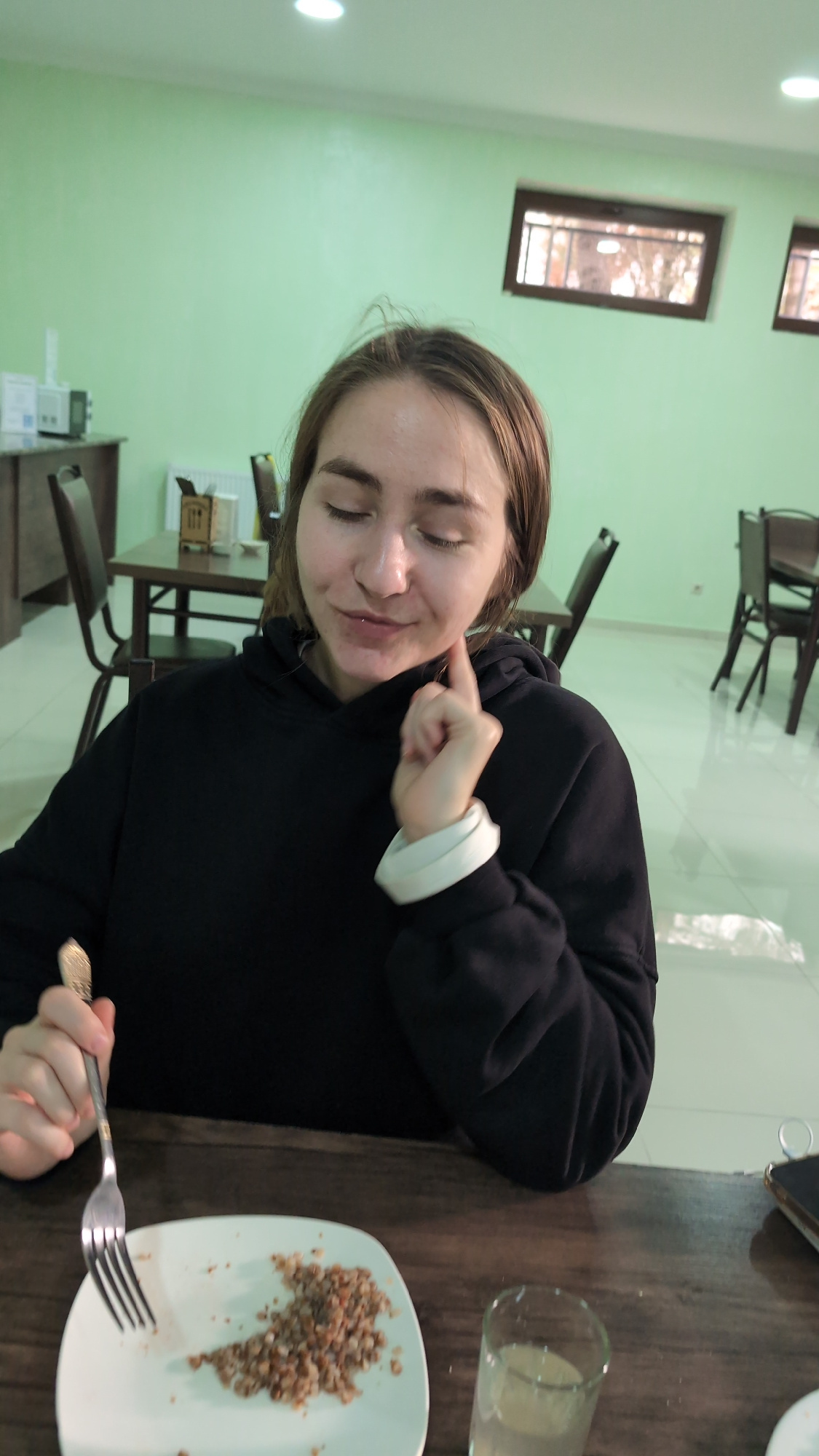 The image shows a woman sitting at a dark wooden table in what appears to be a dining area. She is wearing a black hoodie with white cuffs. She has fair skin and brown hair and her eyes are closed, an…read more