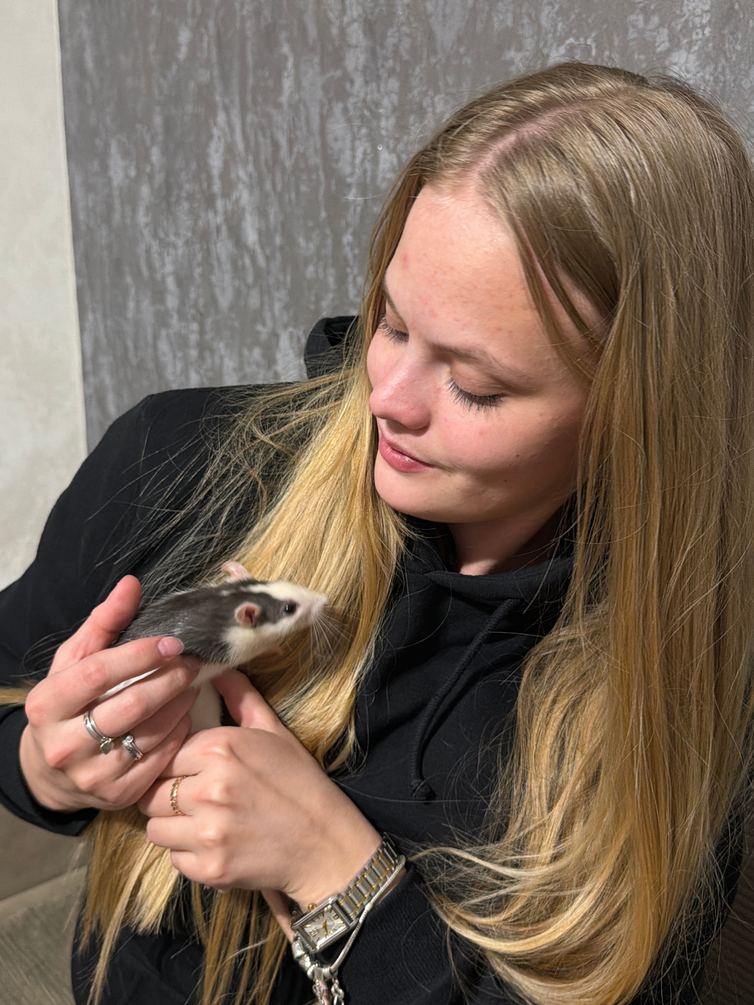 A young woman with long, blond hair and fair skin is holding a ferret in her hands. She is wearing a black hoodie, a watch, and several rings. The ferret is gray and white. The background is a gray wa…read more