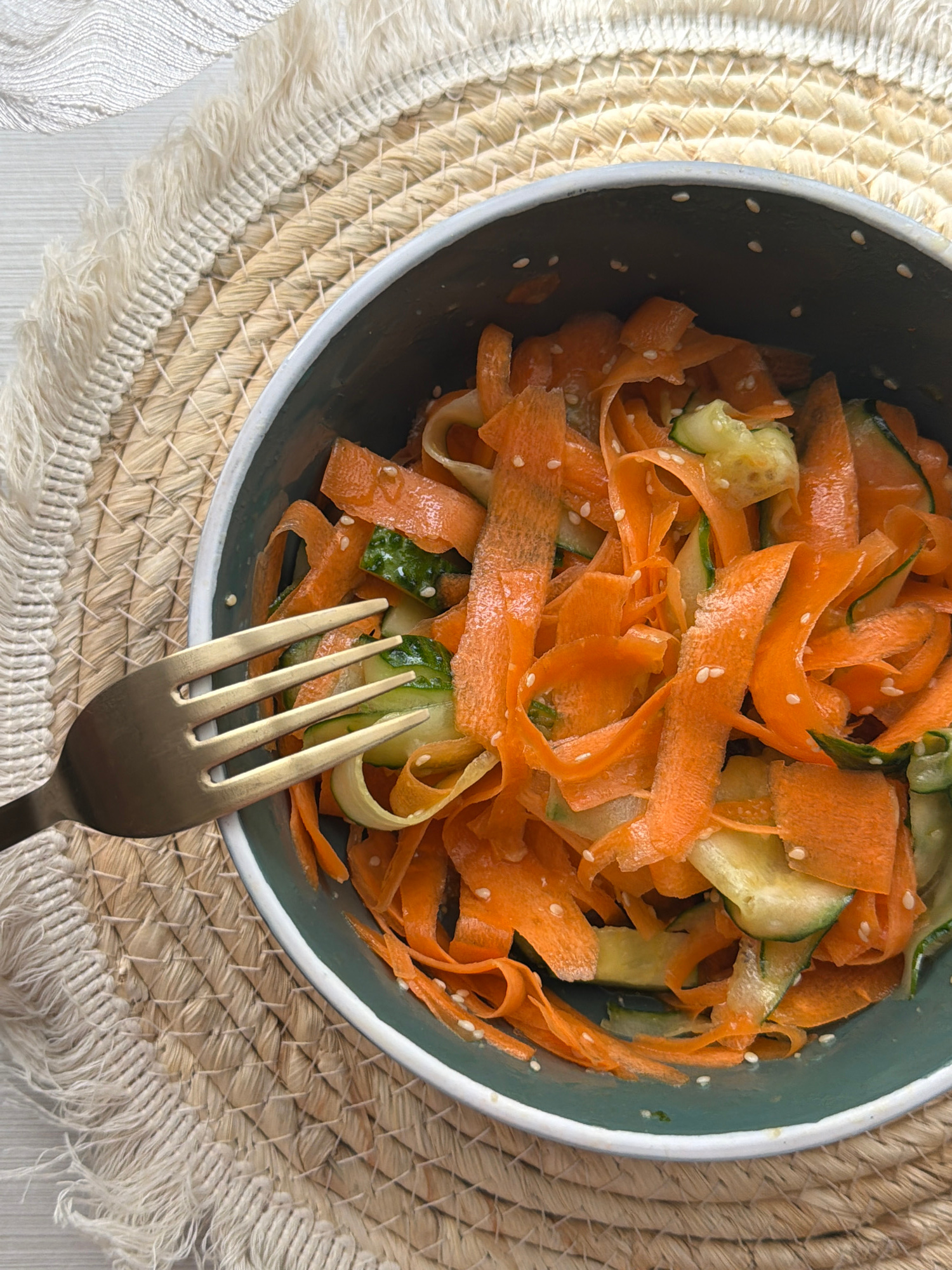 A high-angle, close-up shot shows a bowl of salad placed on a round, woven placemat with fringed edges. The salad comprises orange carrot shavings and sliced green cucumbers, sprinkled with white sesa…read more