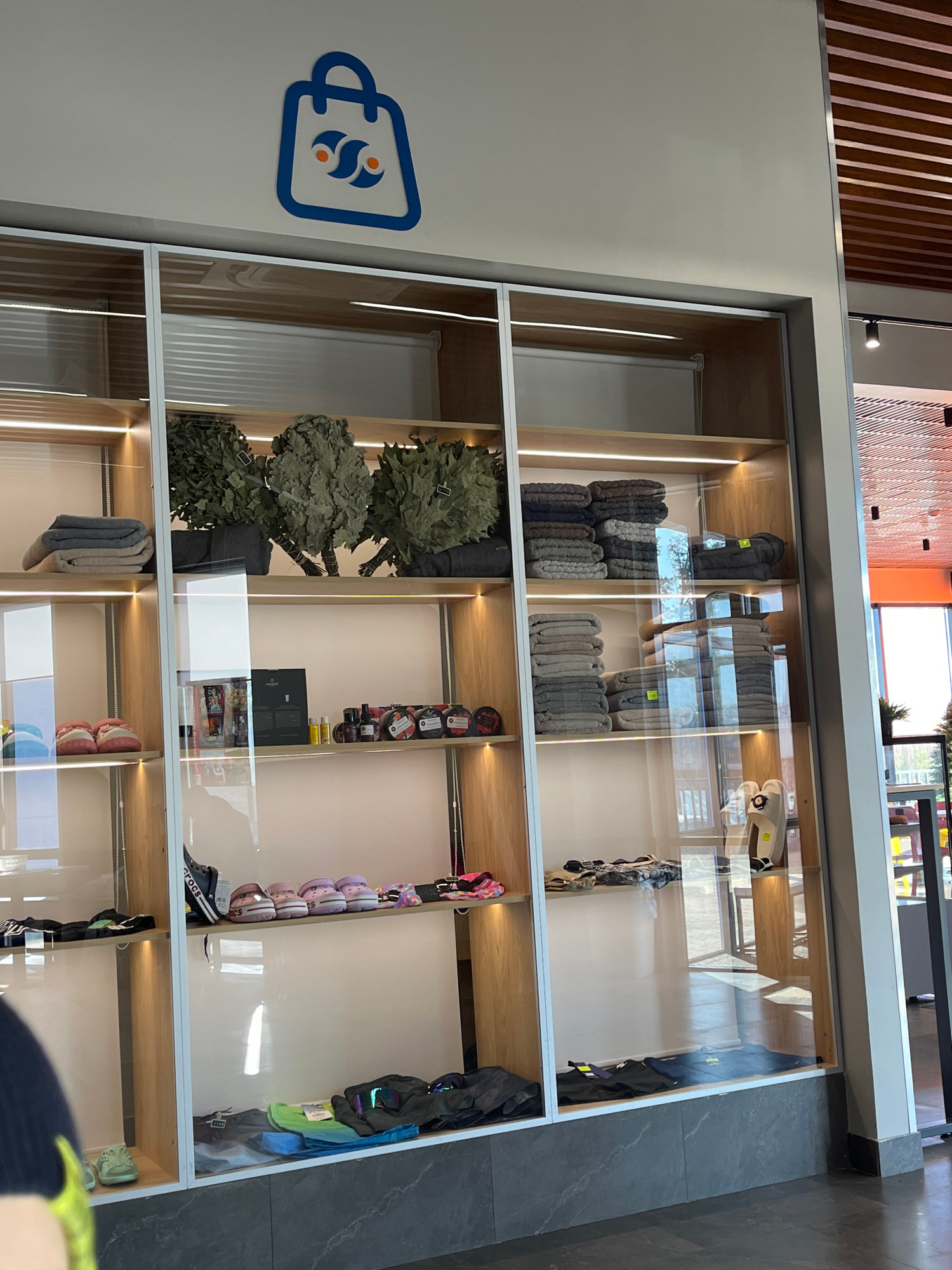 The image shows a display shelf inside a store, likely in Votkinsk, Russia. The shelf has four tiers. The top tier contains rolled towels, bathrobes, and slippers. The second tier displays bundles of…read more