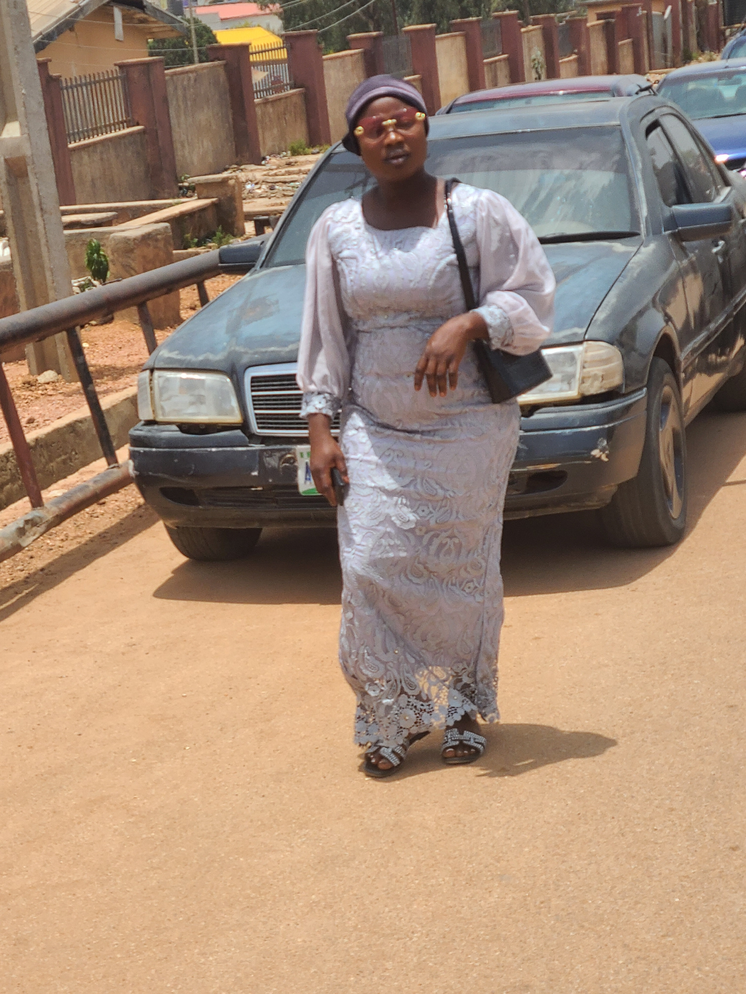 An adult African woman is standing on a paved road beside a dark colored sedan, possibly a Mercedes-Benz. She wears a long, pale dress with floral patterns and lace detailing, a dark head wrap, and sa…read more