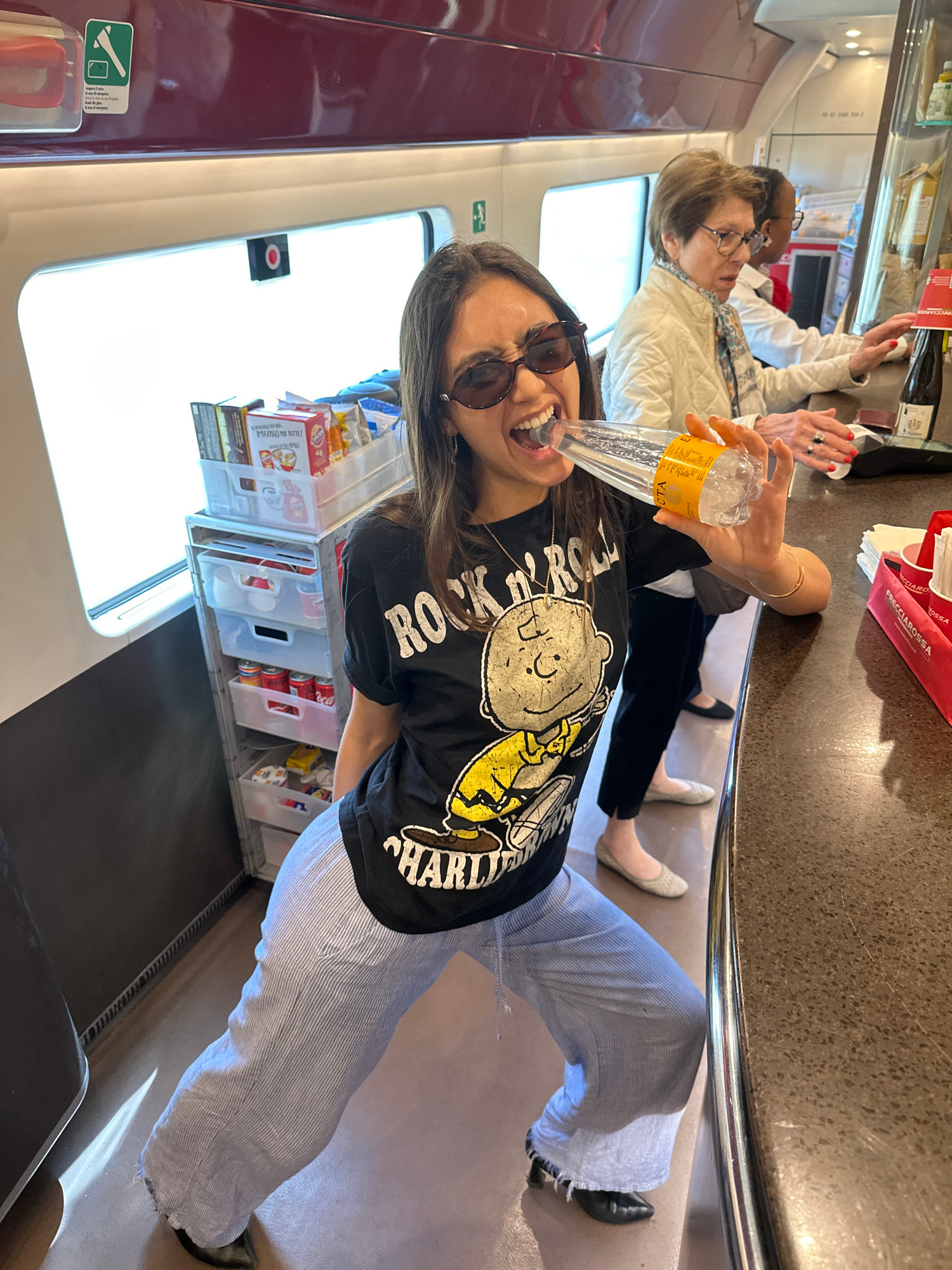 The image shows the interior of a train, with a woman wearing sunglasses, a black t-shirt featuring a cartoon character, and blue striped pants drinking from a clear plastic water bottle. Another woma…read more