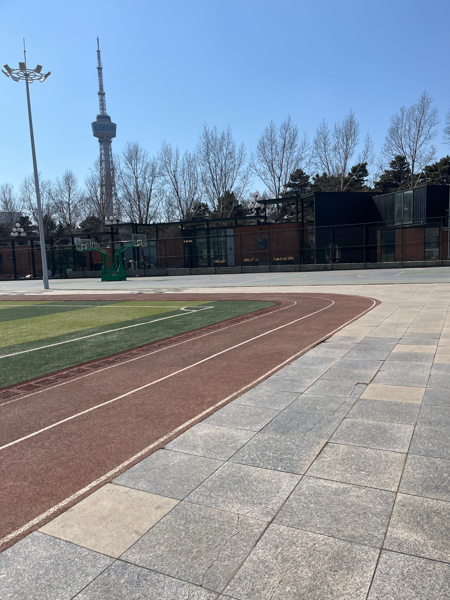 The image shows a track and field facility on a sunny day in Changchun City, China. A grey-tiled pedestrian area is adjacent to a red running track marked with white lines. A green sports field is wit…read more