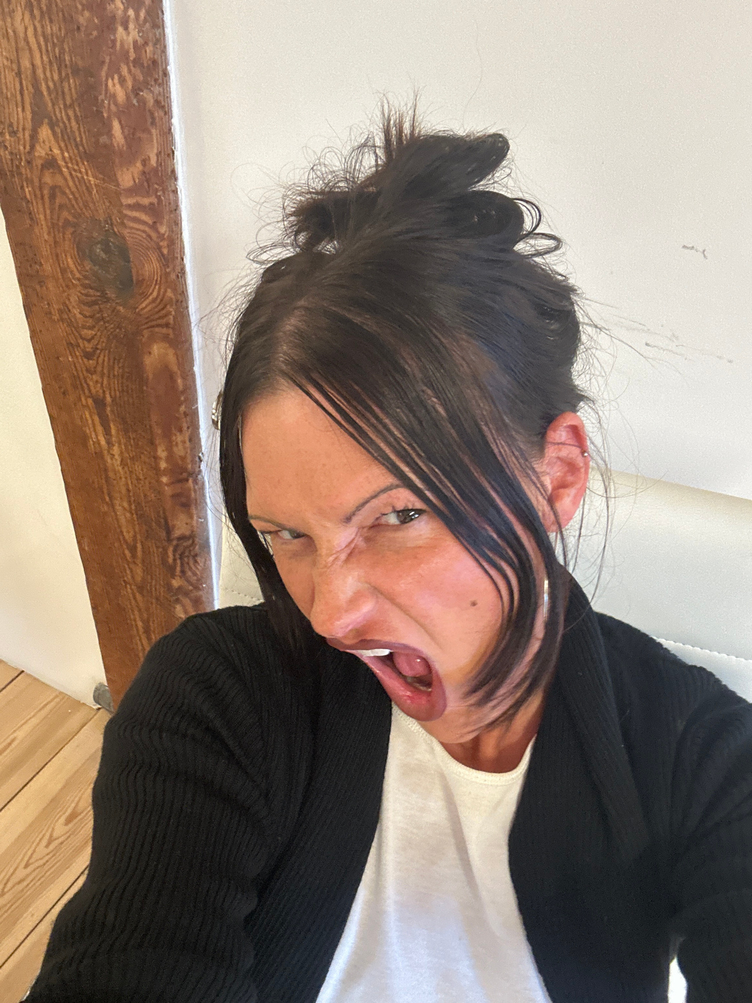 A sideways portrait captures an individual with dark hair and an exaggerated facial expression, taken indoors. The person is seen from the chest up, wearing a white t-shirt beneath a black ribbed card…read more