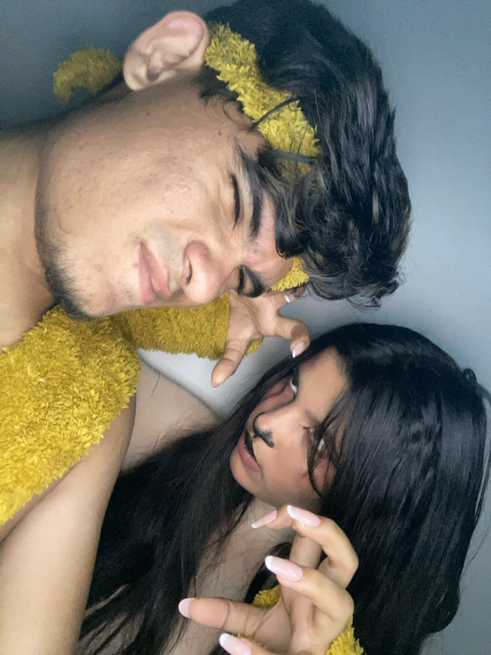 A selfie-style shot shows two people. The individual on the left has dark hair, a yellowish headband, and is pulling a pained expression. The person on the right, slightly behind, has long dark hair,…read more