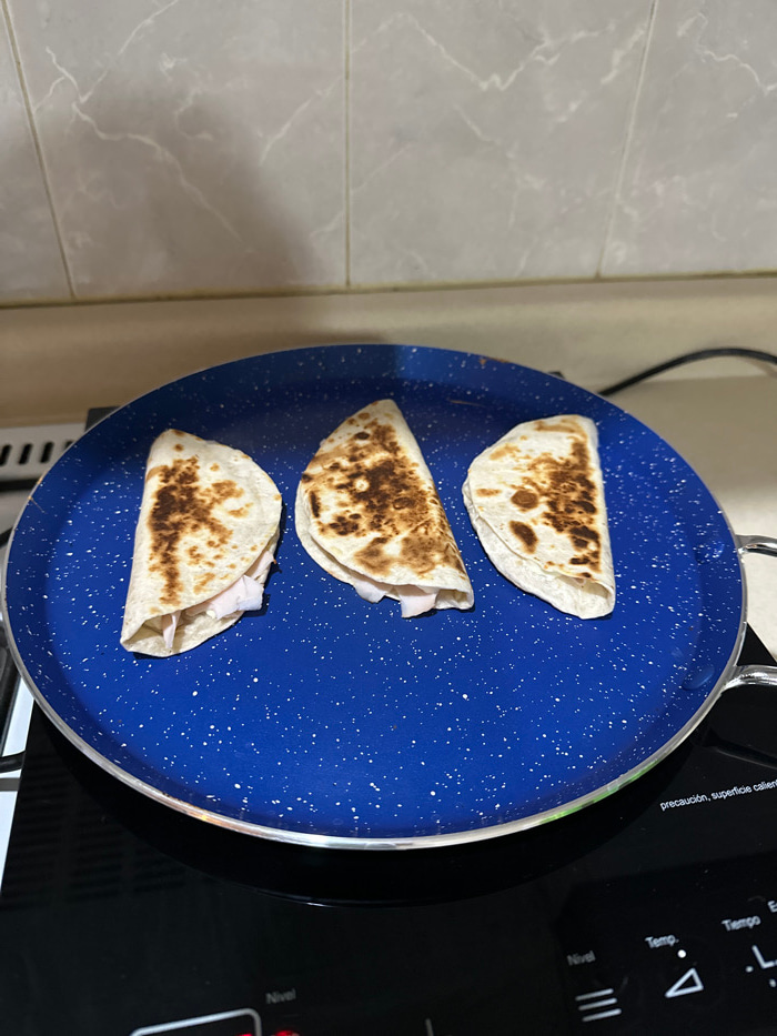 The image depicts an indoor kitchen scene in Puebla, Mexico. Three partially cooked, folded tortillas, appearing to be quesadillas with visible ham filling, are arranged on a round, blue non-stick gri…read more