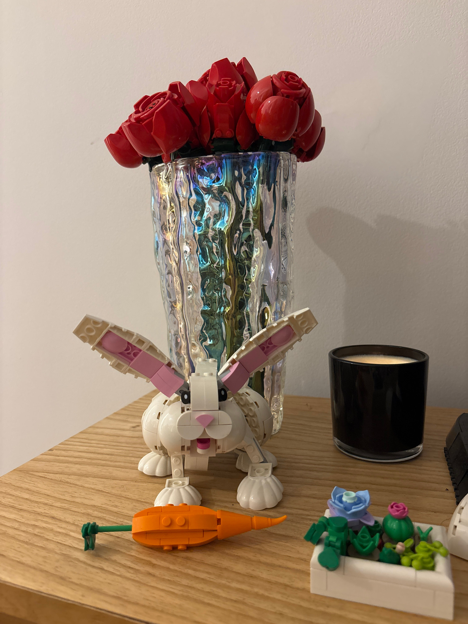 The image depicts a still life arrangement. Dominating the scene is a vase filled with a bouquet of red roses. Adjacent to the vase is a Lego rabbit figurine holding a carrot. Behind the rabbit is a b…read more