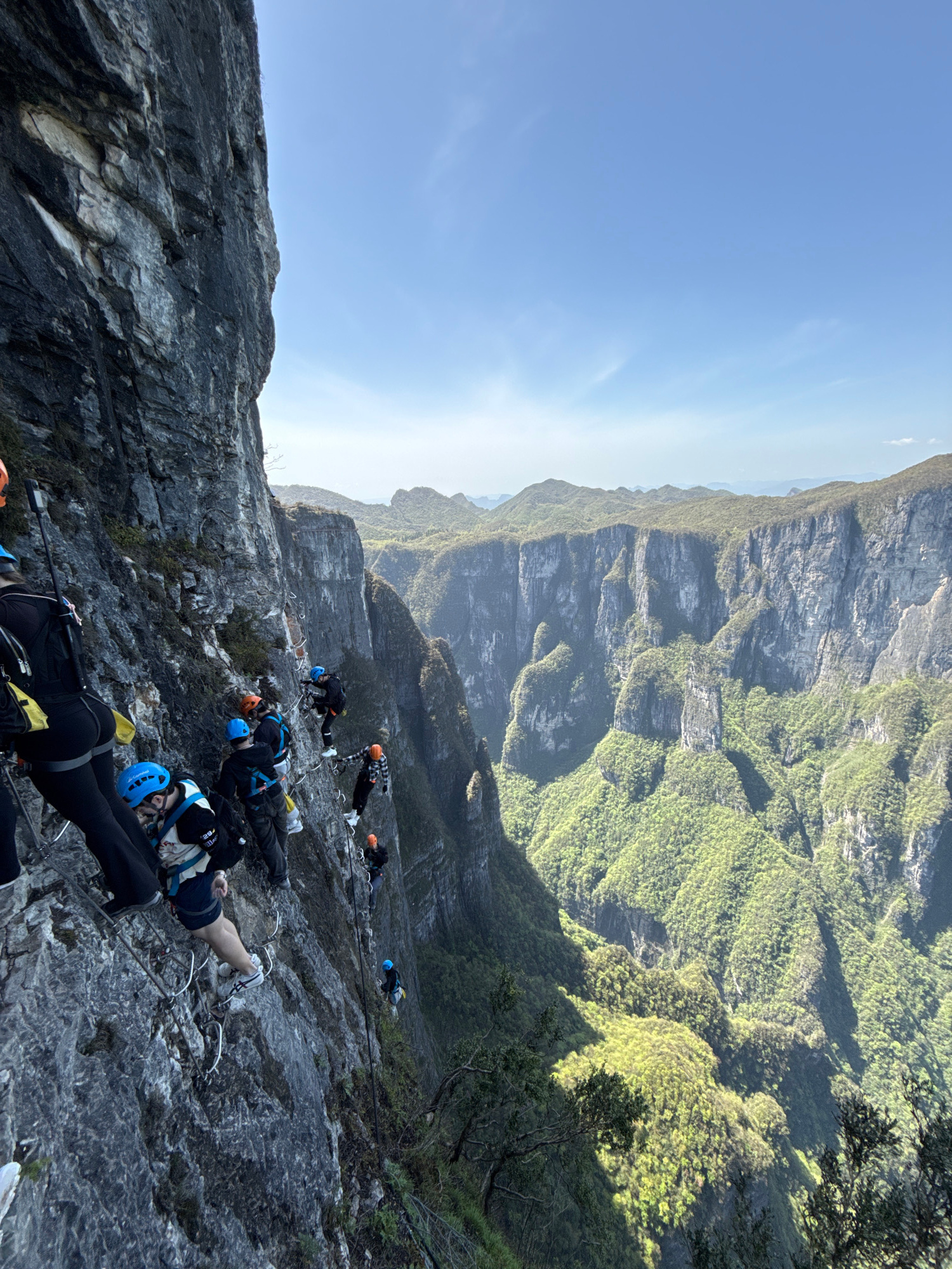 A group of adventurers is seen ascending a steep, rugged rock face via a via ferrata route in a mountainous region, identified as Yongding District, China. The scene is set under a clear, bright blue…read more
