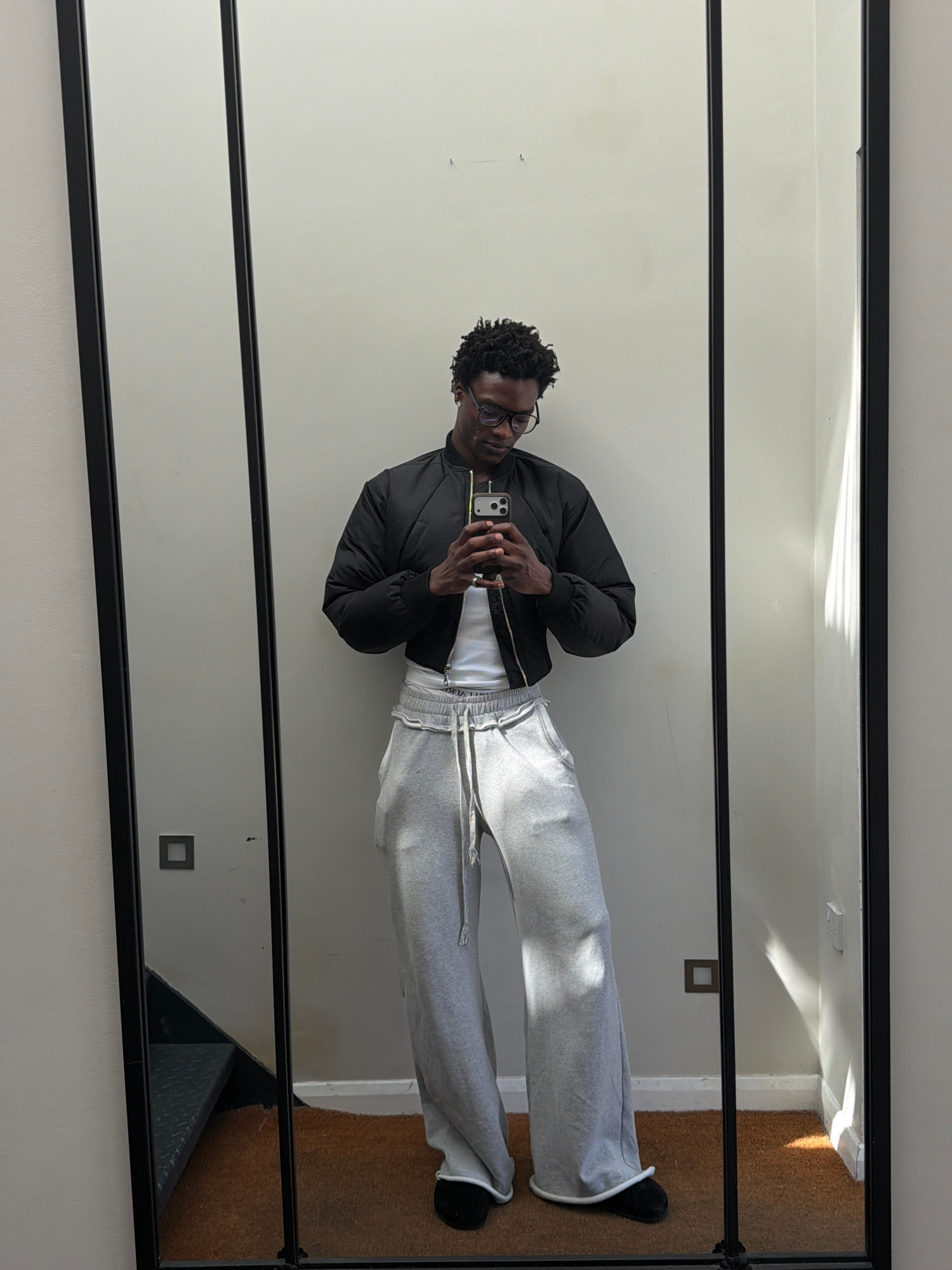 The image depicts a man reflected in a full-length mirror. He is wearing glasses, a black bomber jacket over a white shirt, and grey sweatpants with black shoes. He is holding a smartphone, presumably…read more