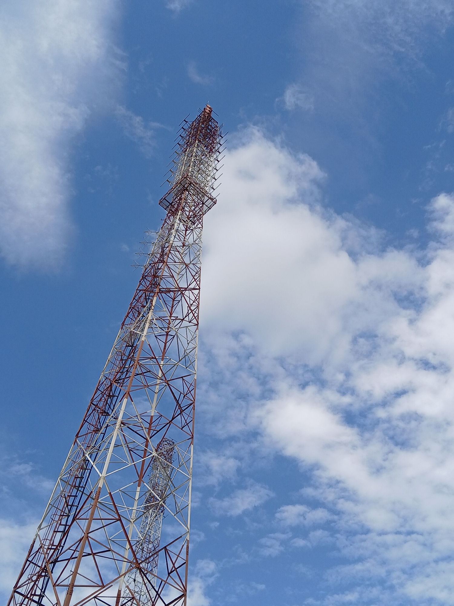 A low-angle shot depicts a tall, lattice-structured telecommunications tower reaching into a bright, blue sky with scattered white clouds. The tower is constructed of red and white metal, forming a ne…read more