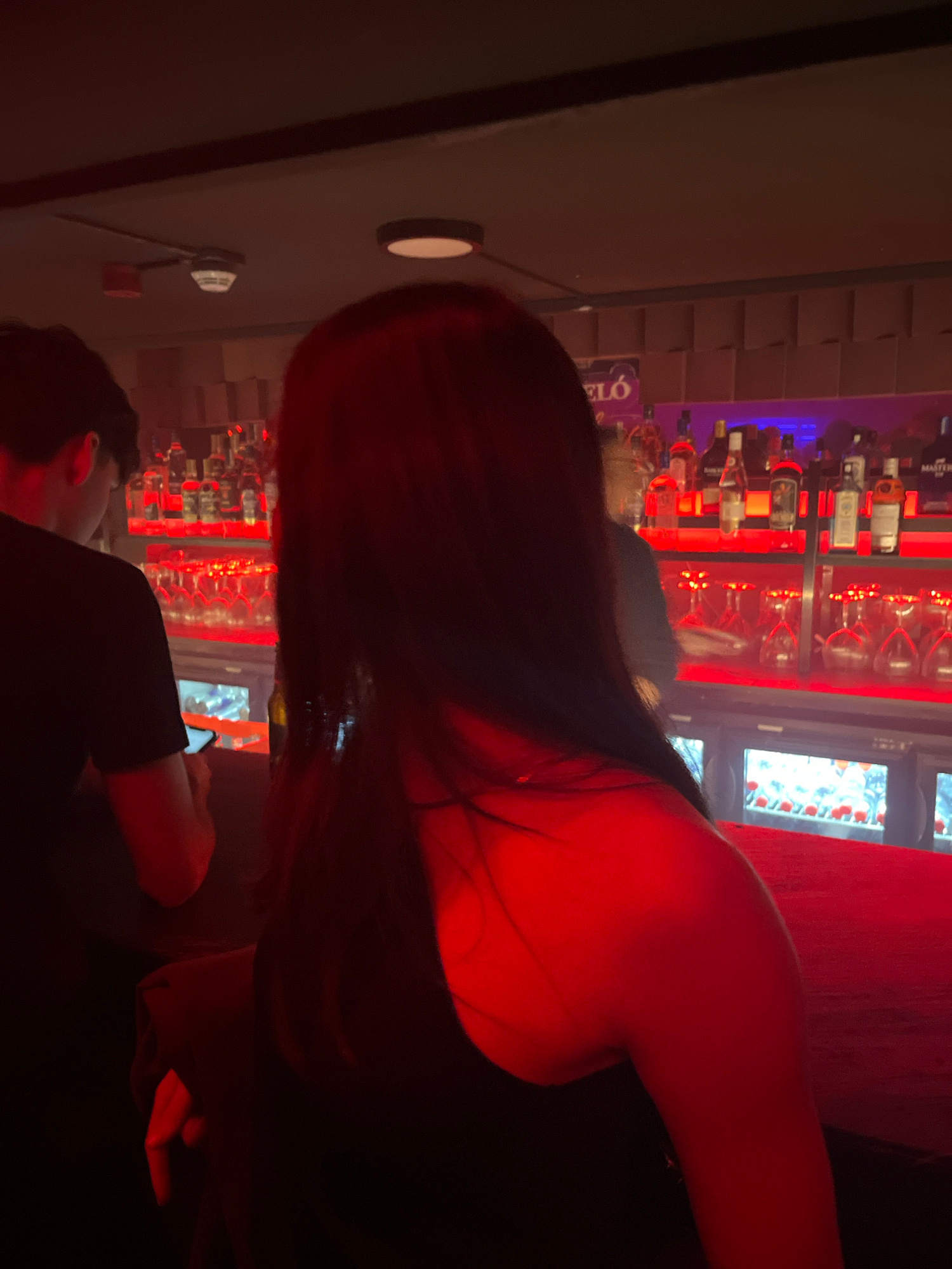 A person is standing in a bar or club in Valencia, Spain. Behind them is a bar stocked with bottles and glasses, illuminated with red light. The location is likely in a dark area with light sources of…read more