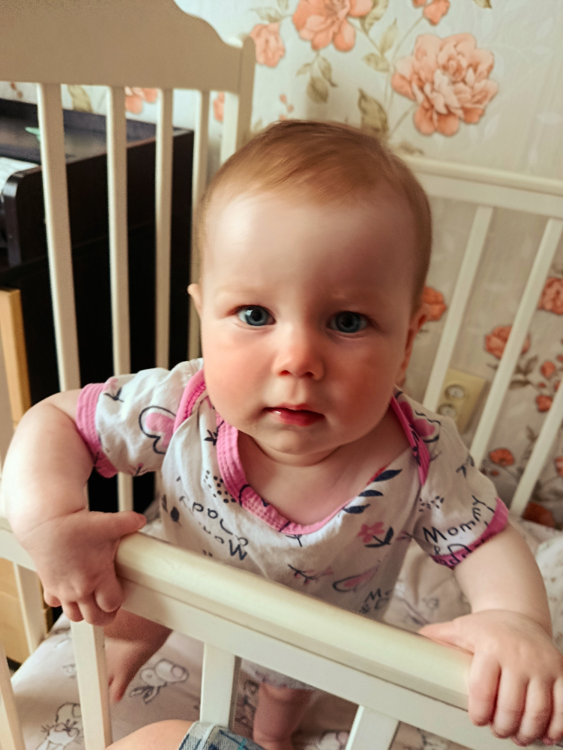 A close-up, eye-level portrait features a baby standing upright inside a white wooden crib, looking directly at the camera. The baby has fair skin, rosy cheeks, bright blue eyes, and light reddish-bro…read more