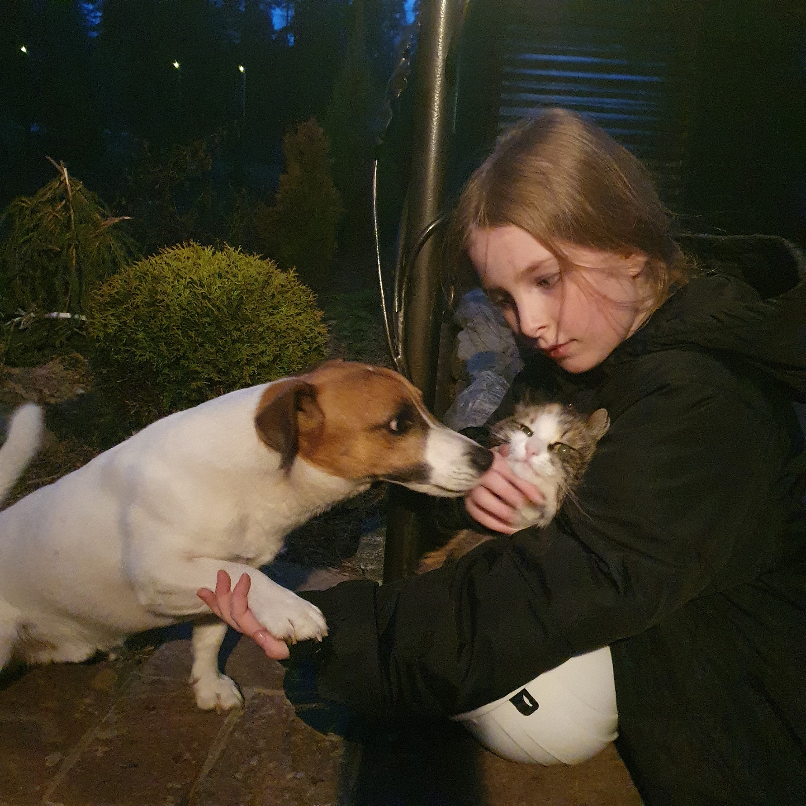 A medium-angle outdoor shot captures a woman interacting with a cat and a dog in Chaikovsky, Russia. The woman, dressed in a black winter jacket, is positioned on the left side of the frame, cradling…read more