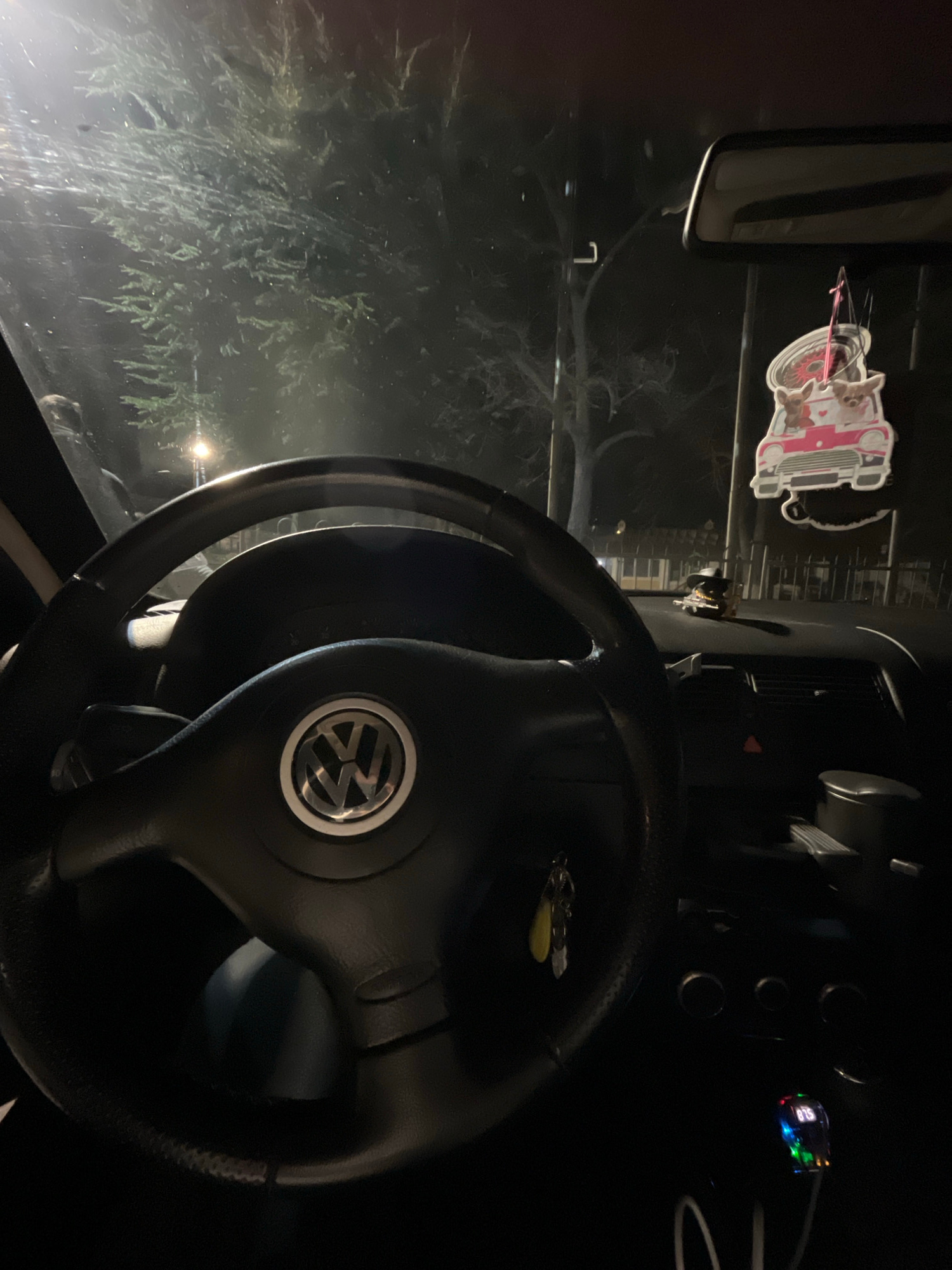 The interior of a car is visible. A black steering wheel with the Volkswagen logo is in the foreground. The dashboard contains several circular controls and a small display with glowing numbers. An ai…read more