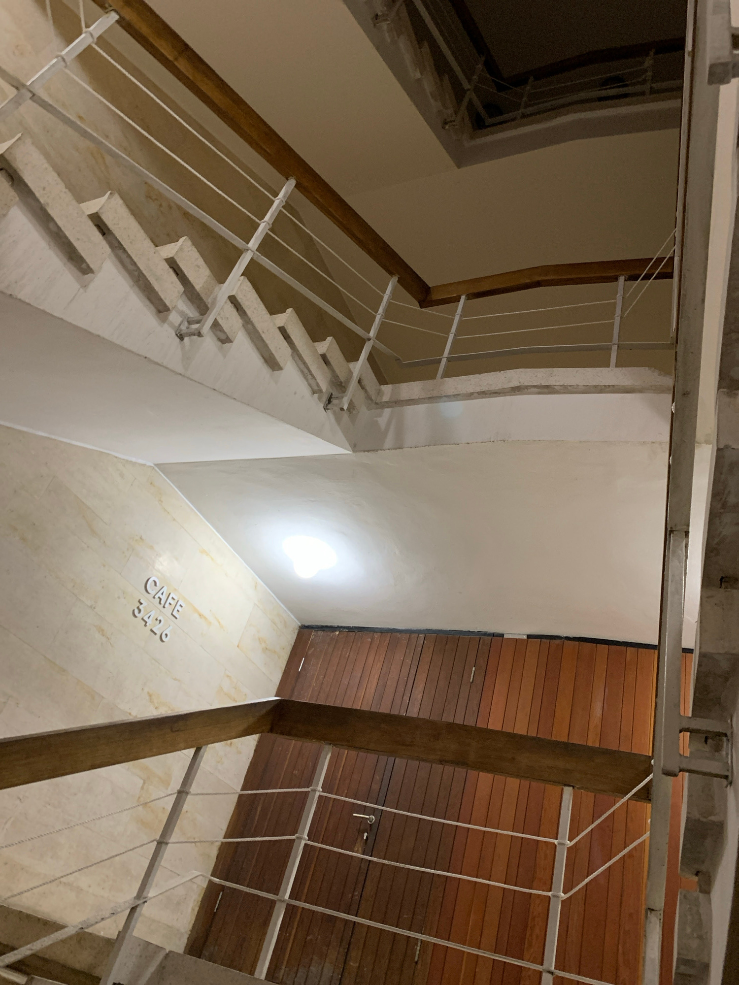 The image displays an interior view of a multi-level staircase within a building in Tel-Aviv, Israel. The vantage point is from an upper floor looking downward across several flights and landings. The…read more