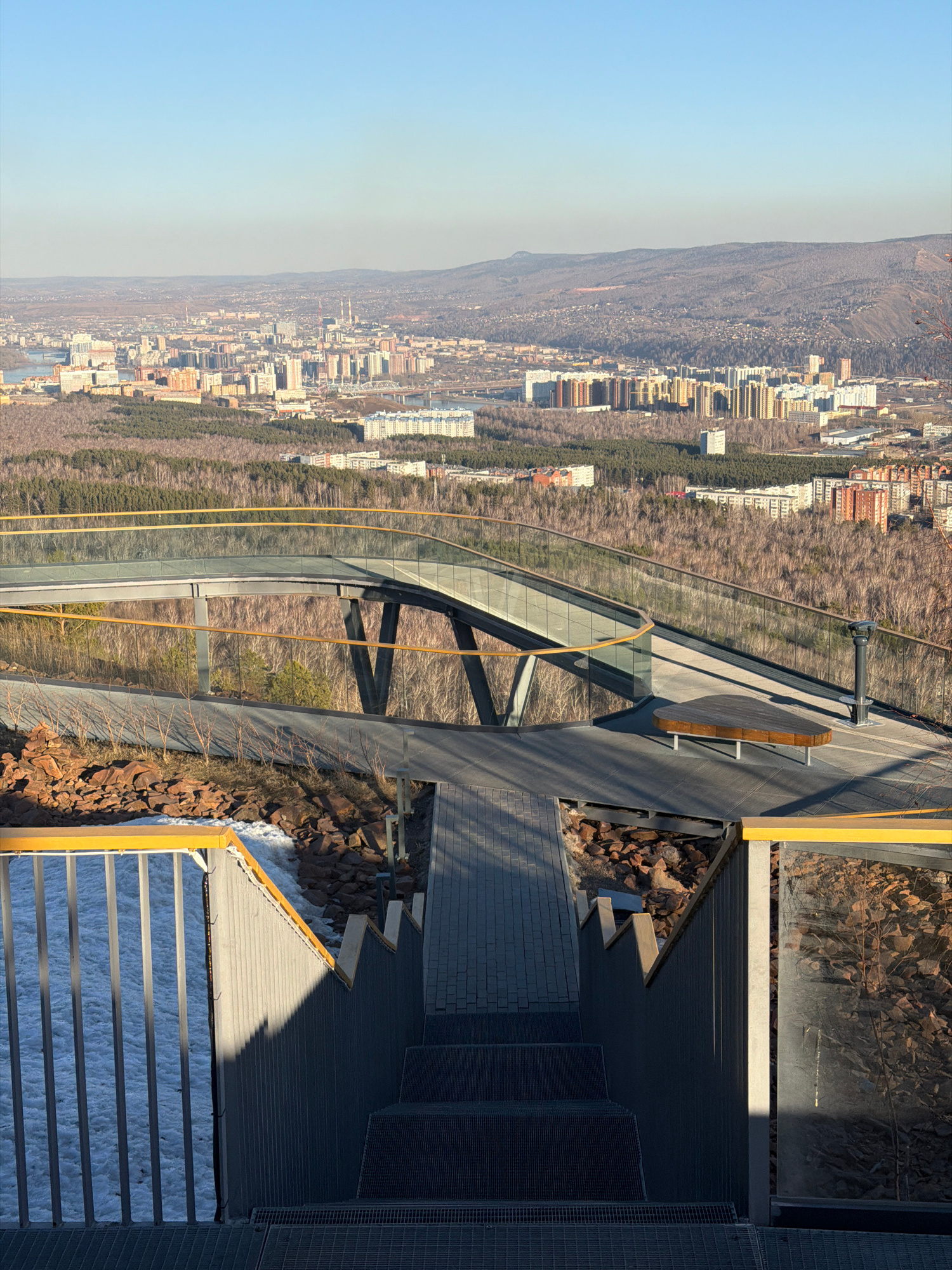 The image shows a panoramic view of Krasnoyarsk, Russia, from the observation deck of the Torgashinsky Ridge. A pedestrian bridge with glass railings extends from the deck, overlooking the city and su…read more