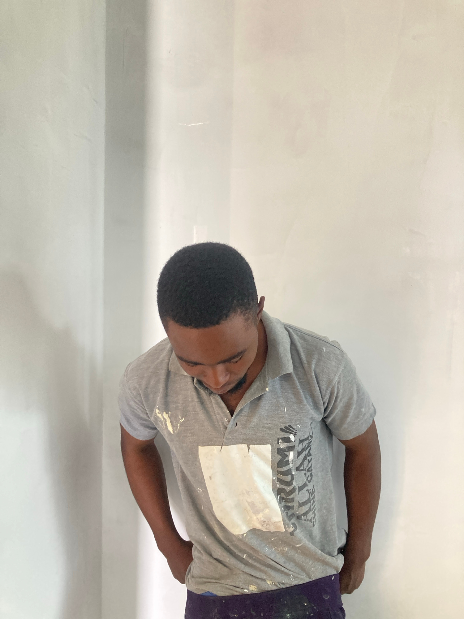 A man is captured from an overhead angle, standing close to a wall. He is wearing a light gray T-shirt with markings on it, along with dark-colored pants. The wall behind him is off-white with slight…read more