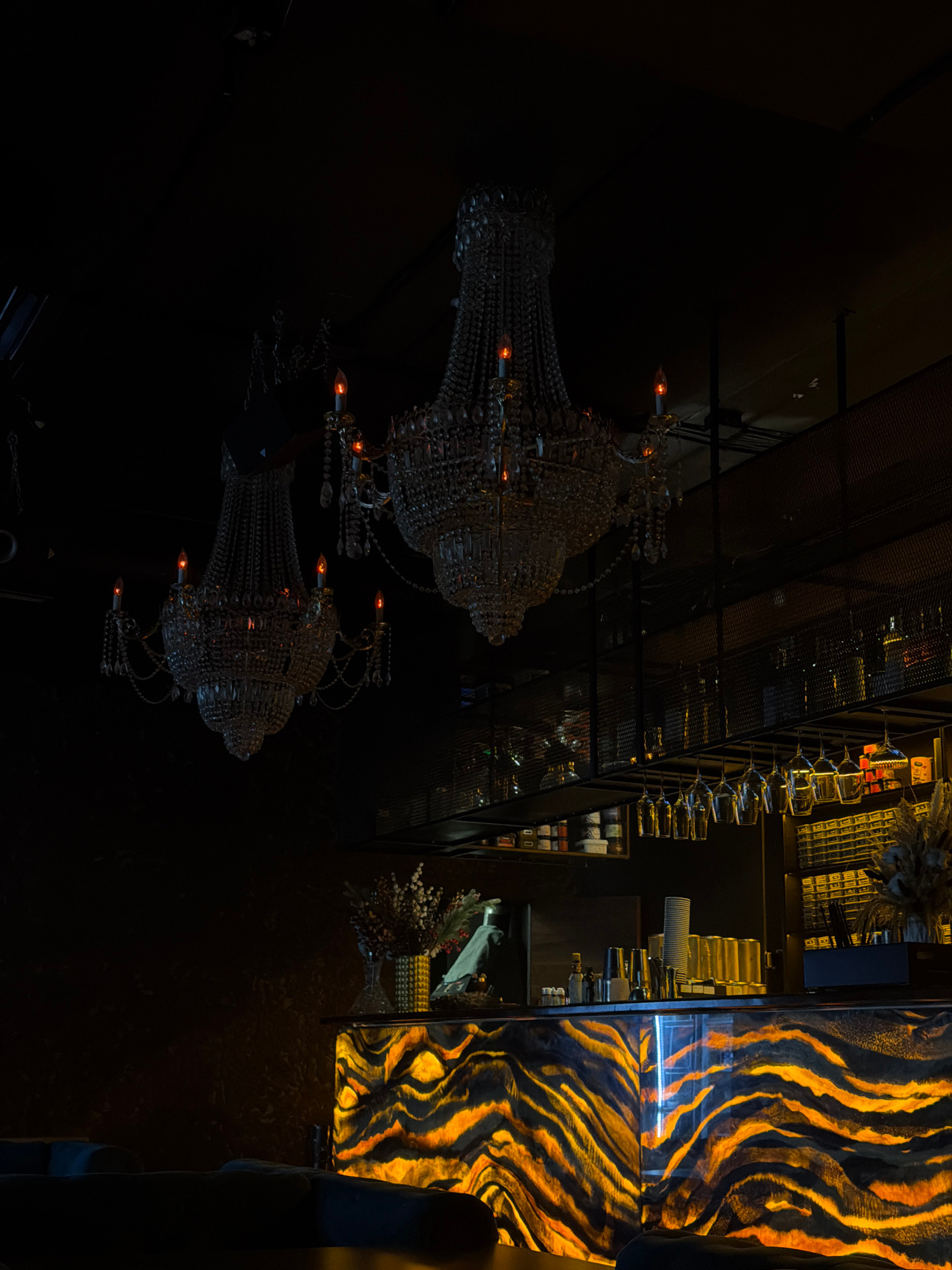 The image depicts the interior of a bar located in Moscow, Russia. The scene is dimly lit, and the camera is oriented upward toward the ceiling. Two large crystal chandeliers are visible, their lights…read more