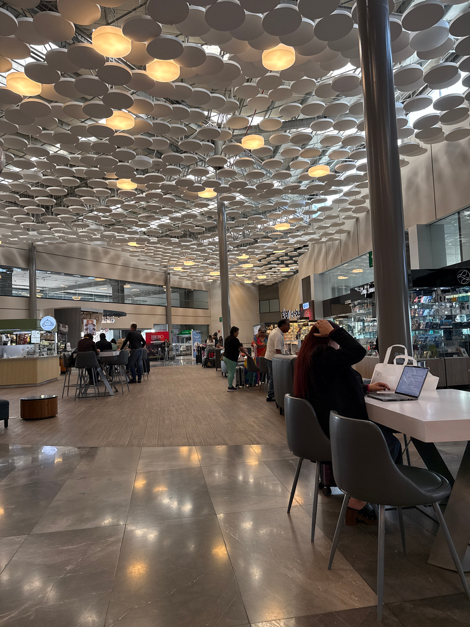 This image depicts a bustling concourse within the Puebla International Airport (Aeropuerto Internacional de Puebla, PBC) in Huejotzingo, Puebla, Mexico. The scene is illuminated by numerous circular…read more