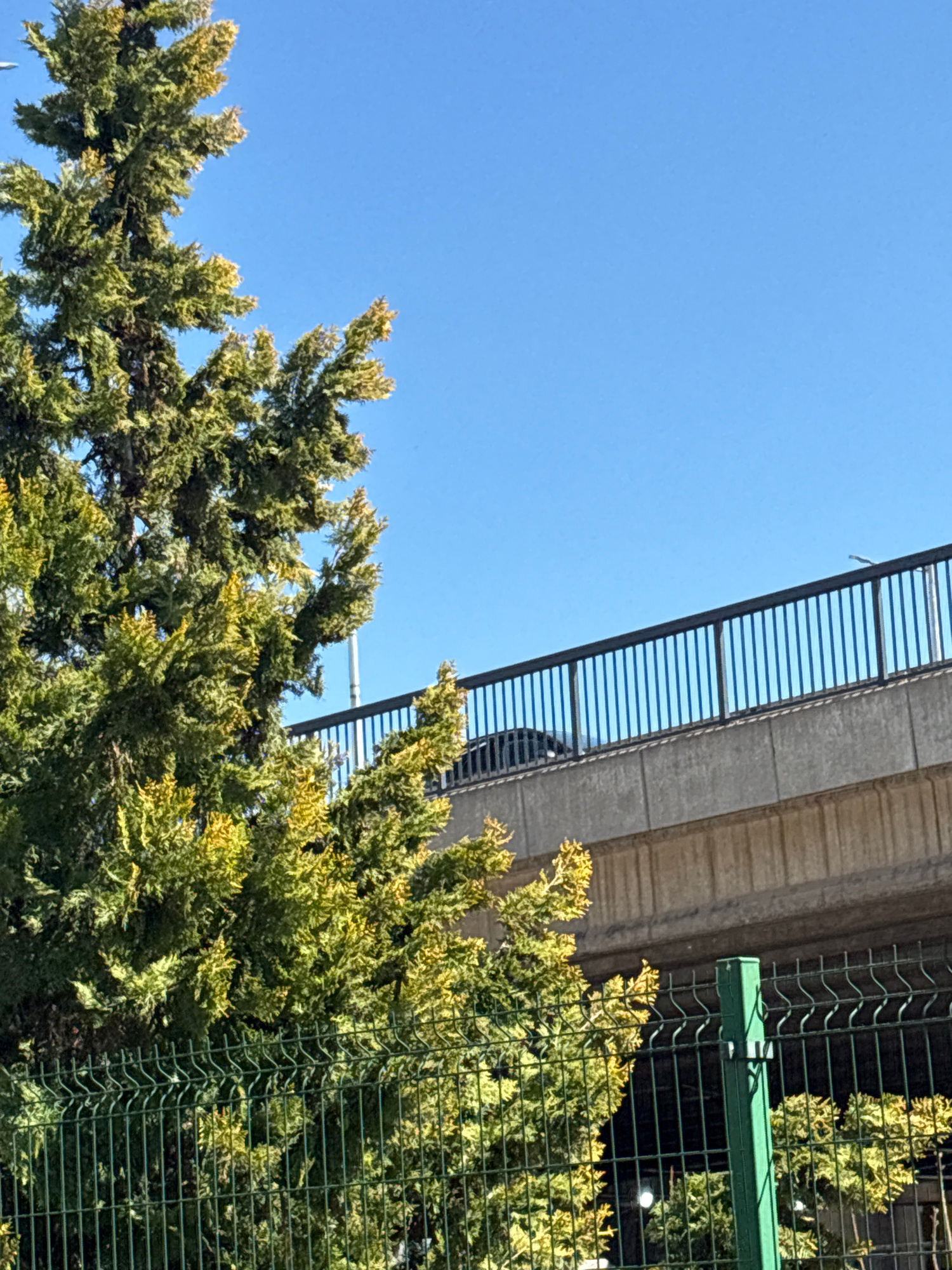 The image depicts an upward view in an urban environment, likely in Plovdiv, Bulgaria, showing a light blue sky partially obscured by a tree with green and yellow foliage. A concrete overpass or bridg…read more