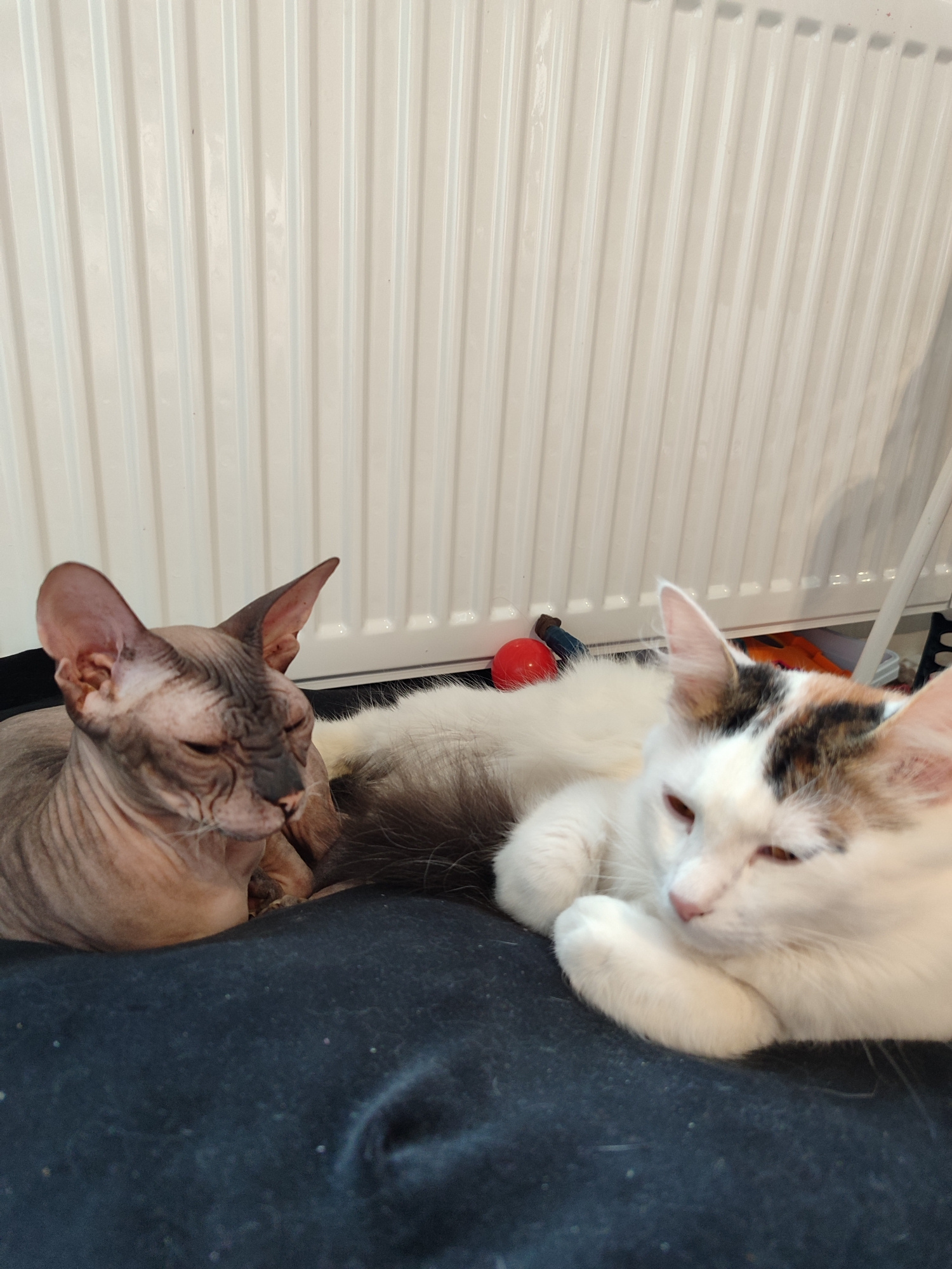 Two cats are resting on a dark surface. The cat on the left appears to be a Sphynx cat, with wrinkled skin and large ears. The cat on the right is white with calico patches on its head. Behind the cat…read more