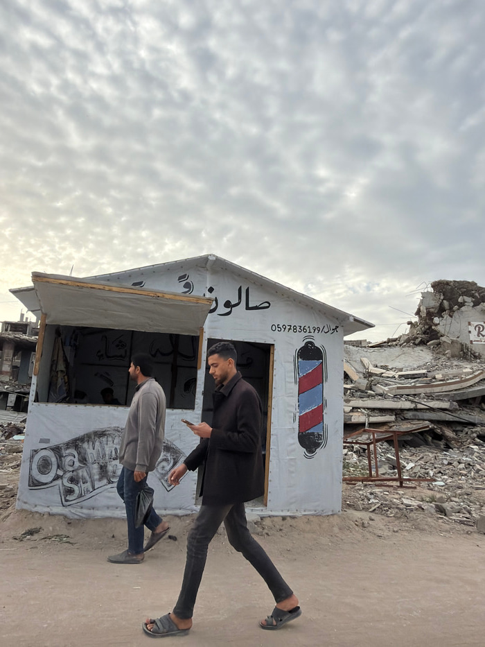 The image depicts a street scene in Jabalia, Palestinian Territory, under an overcast sky. In the foreground, a man walks from right to left, dressed in a dark brown coat, dark trousers, and grey slip…read more