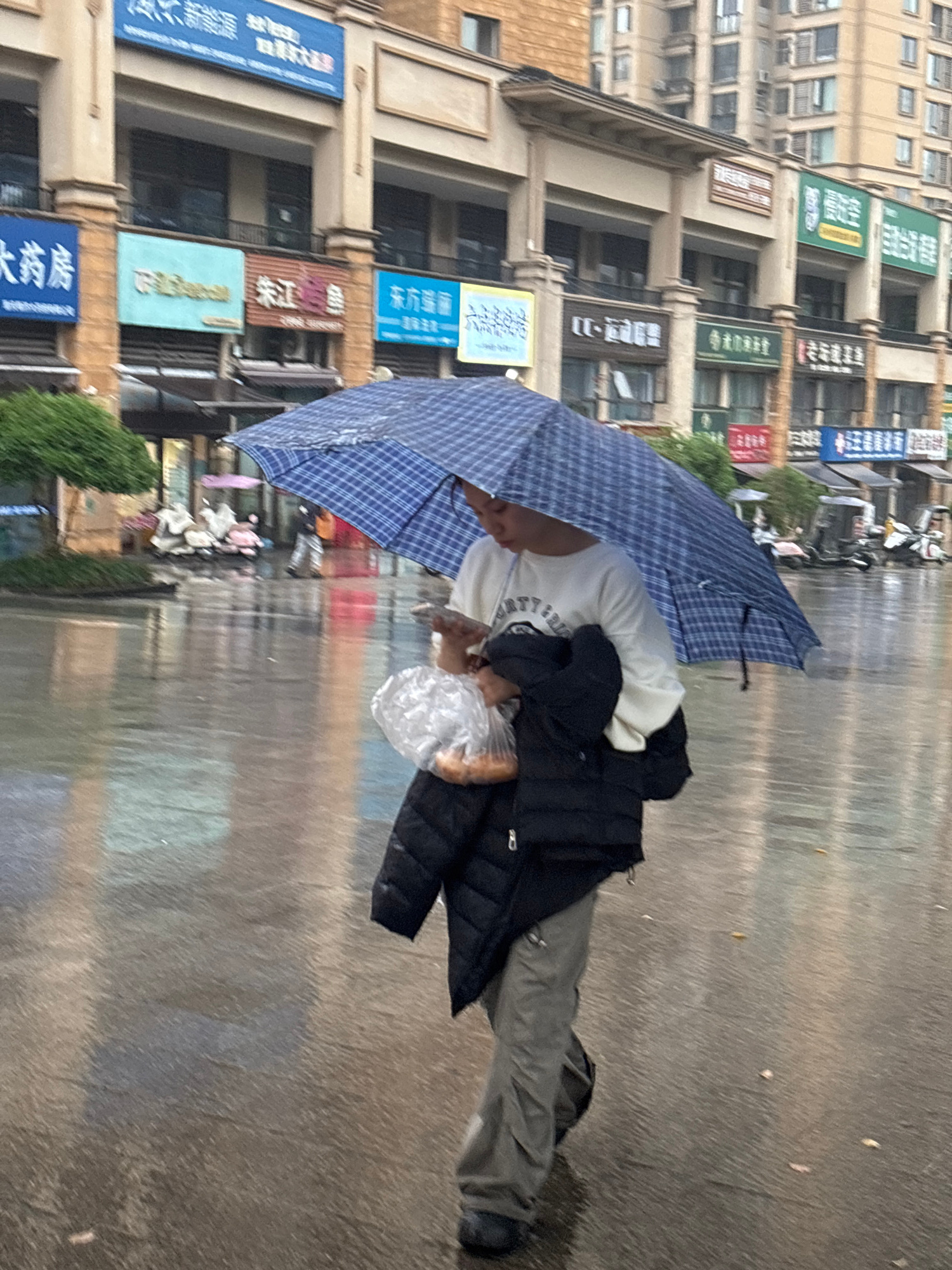 In Jiangjin, China, a person with dark hair walks on a wet city street holding a blue and white checkered umbrella. The individual wears a light-colored sweatshirt, dark pants, and a black jacket. The…read more