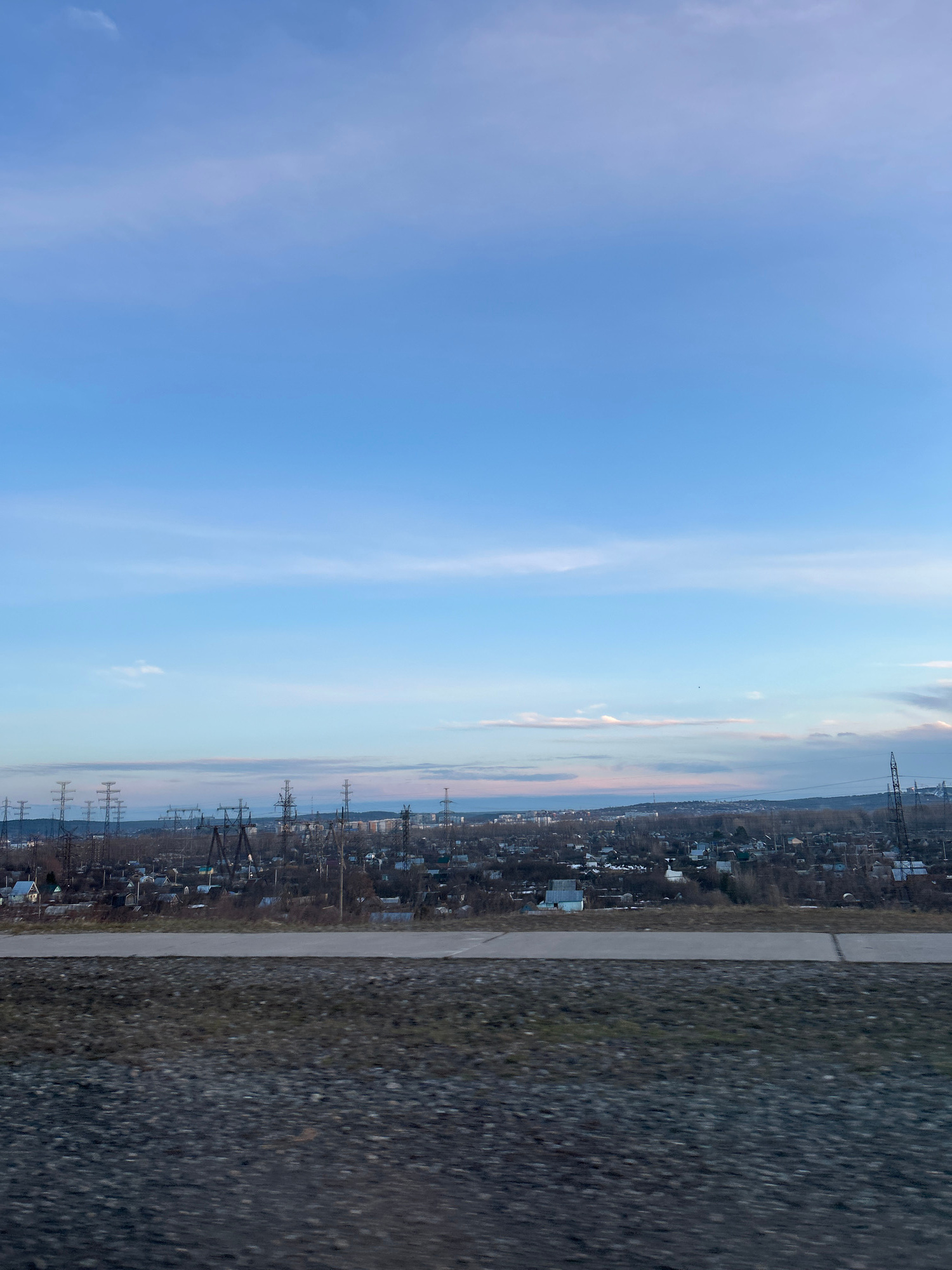 The image shows a view overlooking a section of Chaikovsky, Russia. Power lines run through the landscape, and residential buildings can be seen in the distance. A portion of asphalt or pavement takesβ¦read more