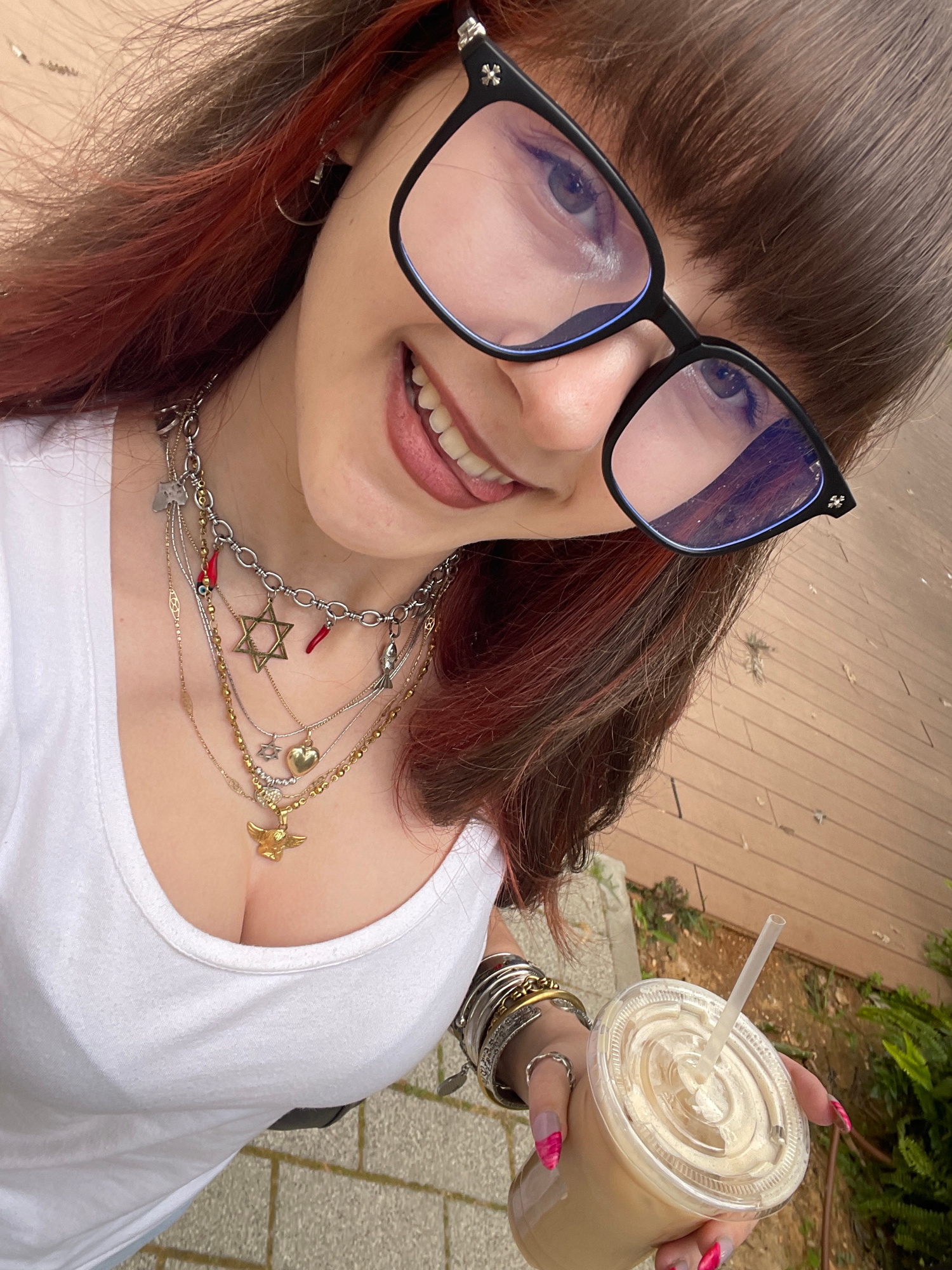 A young woman in Raanana, Israel, is taking a selfie outdoors. She has brown hair with red highlights, glasses, and is wearing a white t-shirt and multiple necklaces. She is holding a plastic cup with…read more