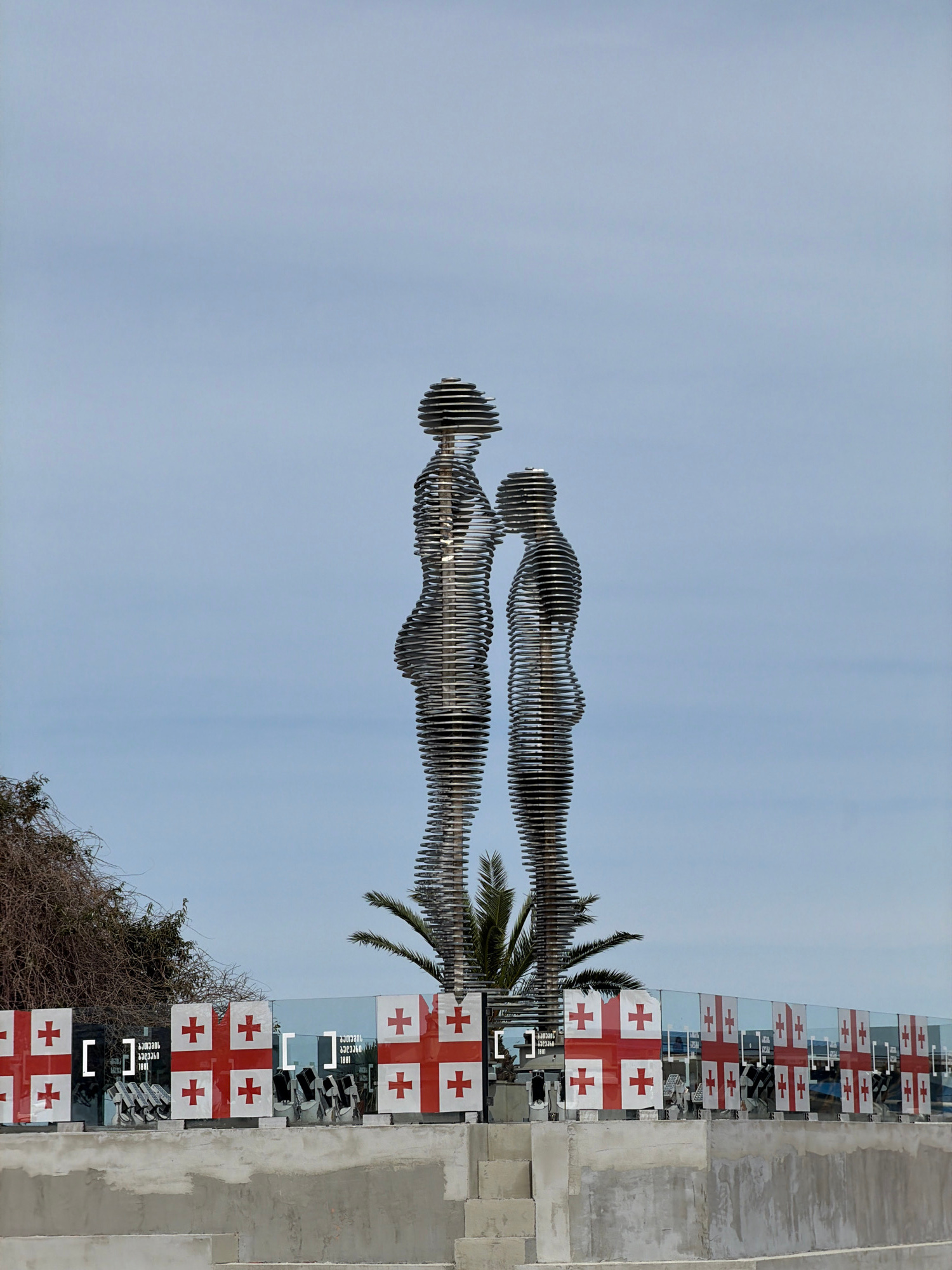 The image depicts the "Ali and Nino" statue in Batumi, Georgia. The statue consists of two abstract, steel-ringed figures representing a man and a woman. These figures are positioned under a clear, pa…read more