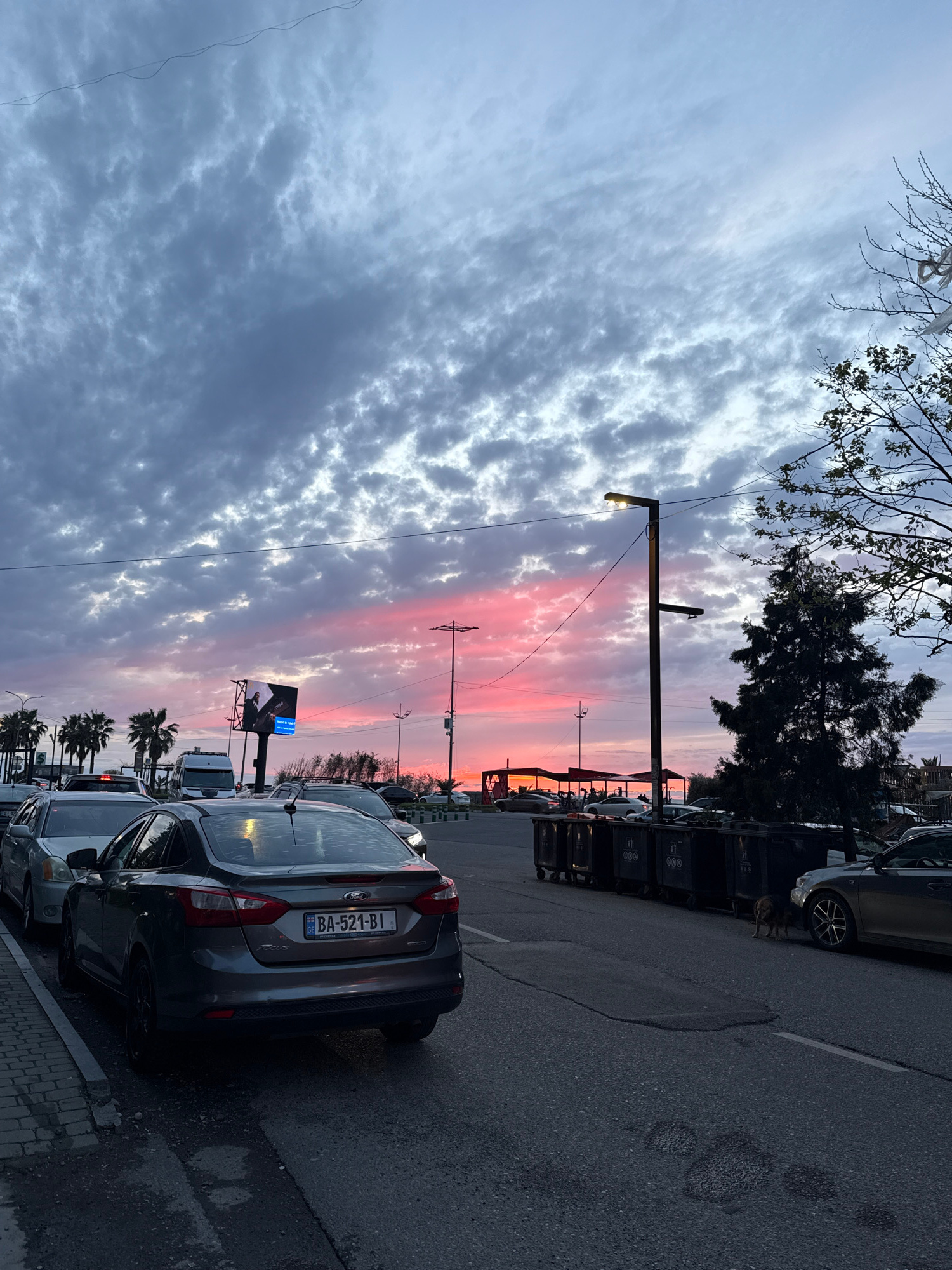 The image depicts a street scene in Batumi, Georgia at sunset. The sky is a mix of grey clouds and pink and orange hues. Cars are parked along the side of the street, with a grey Ford Focus prominentl…read more