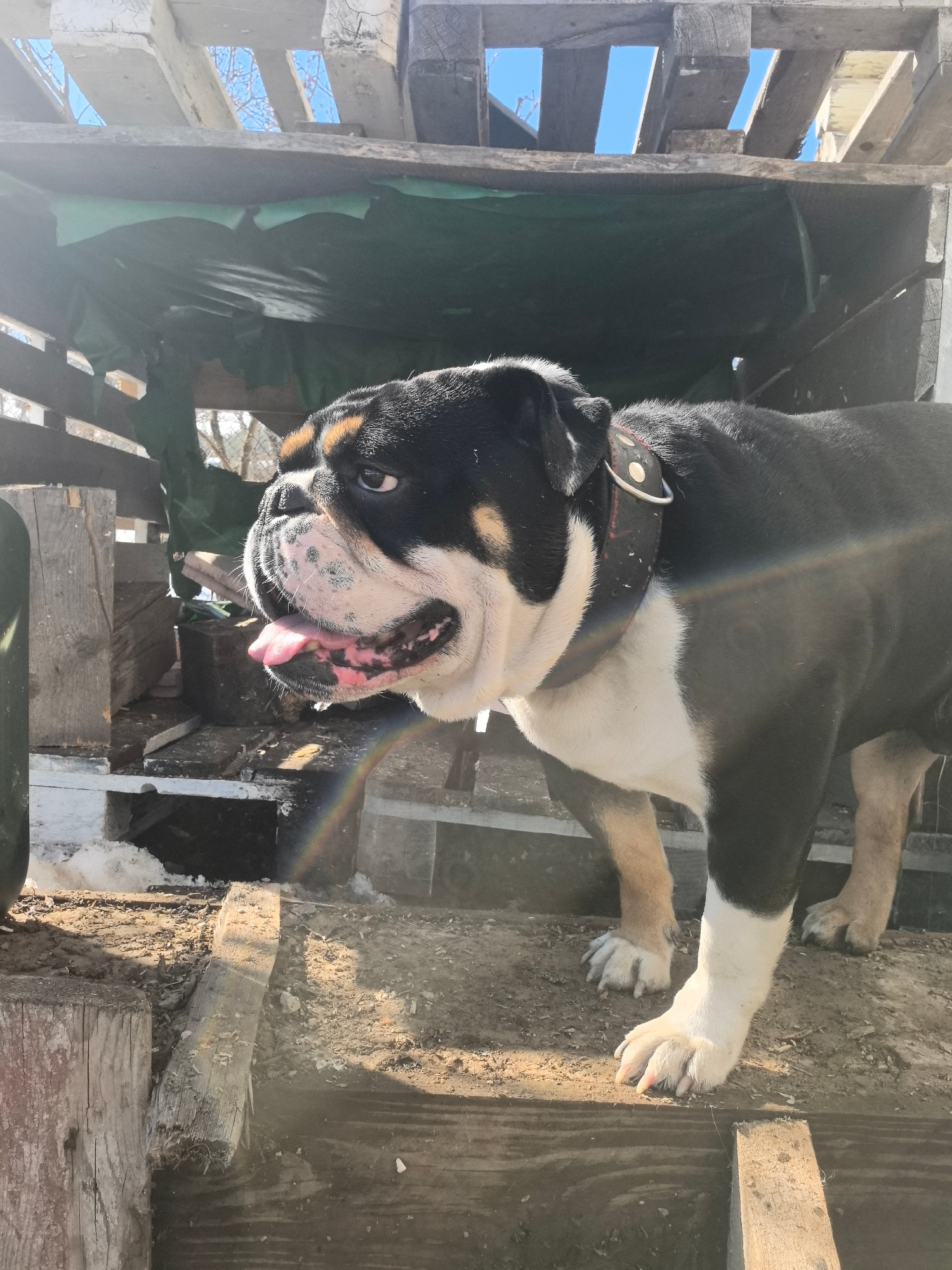 An English Bulldog, characterized by its black, white, and tan fur, stands outdoors in Noviy, Russia. The dog wears a dark collar with light-colored circular studs and a metal ring. Its tongue is slig…read more