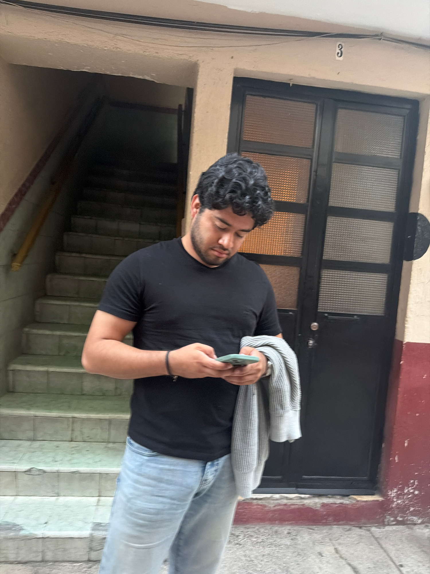A medium shot, composed at an oblique angle, depicts a man using a cell phone while standing on the stairs of a building in Puebla, Mexico. The man has dark curly hair, a beard, and a dark complexion.…read more