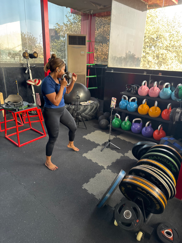A barefoot woman in dark leggings and a blue shirt lifts a kettlebell to her chest in a gym. Shelves of colorful kettlebells and weight plates line the wall. A black tire and exercise ball are visible…read more
