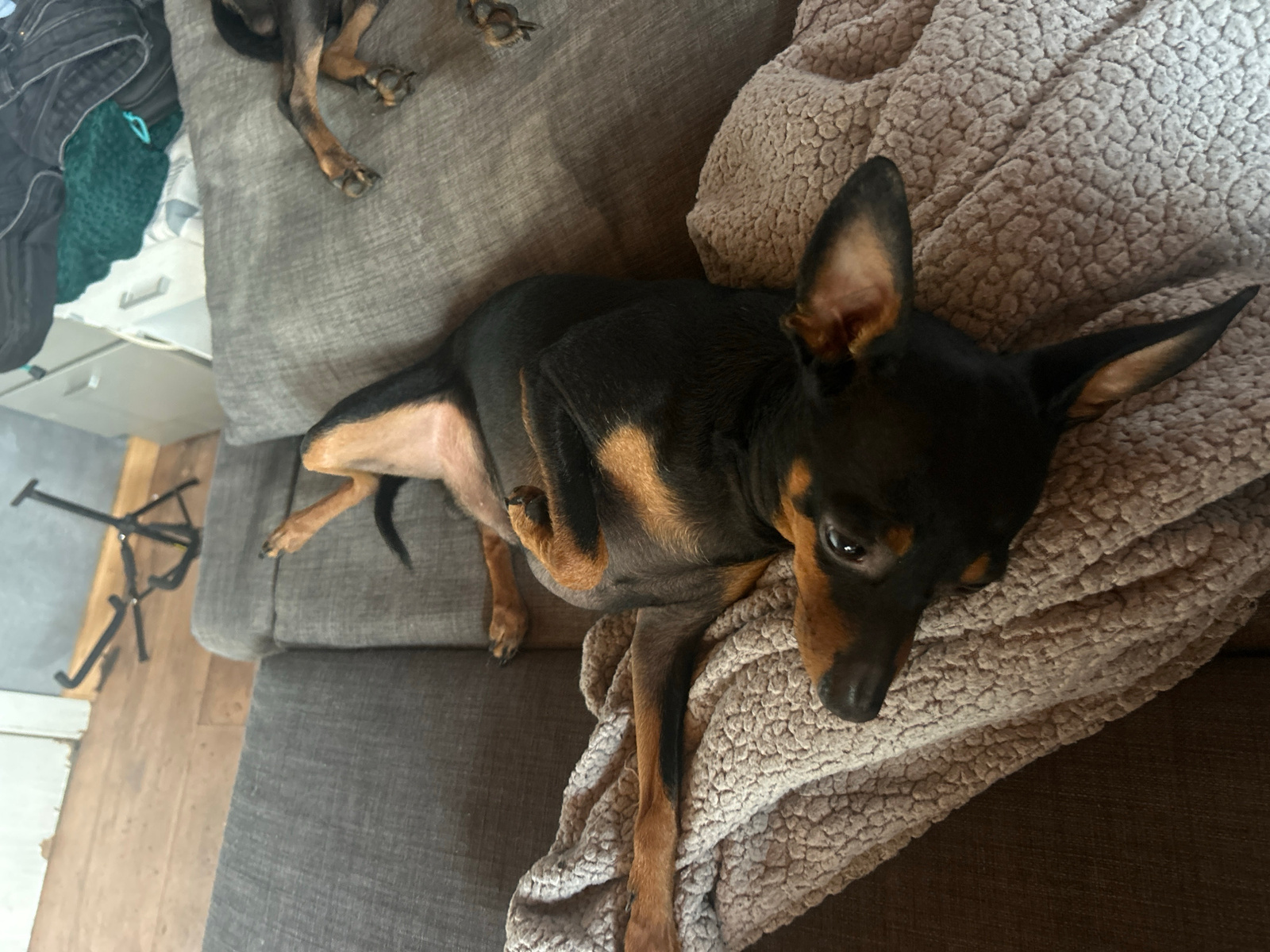 A black and tan miniature pinscher is lying on a gray couch with a light brown blanket. Part of another dog is visible in the upper left corner. A small, black tripod is visible on the wood floor to t…read more