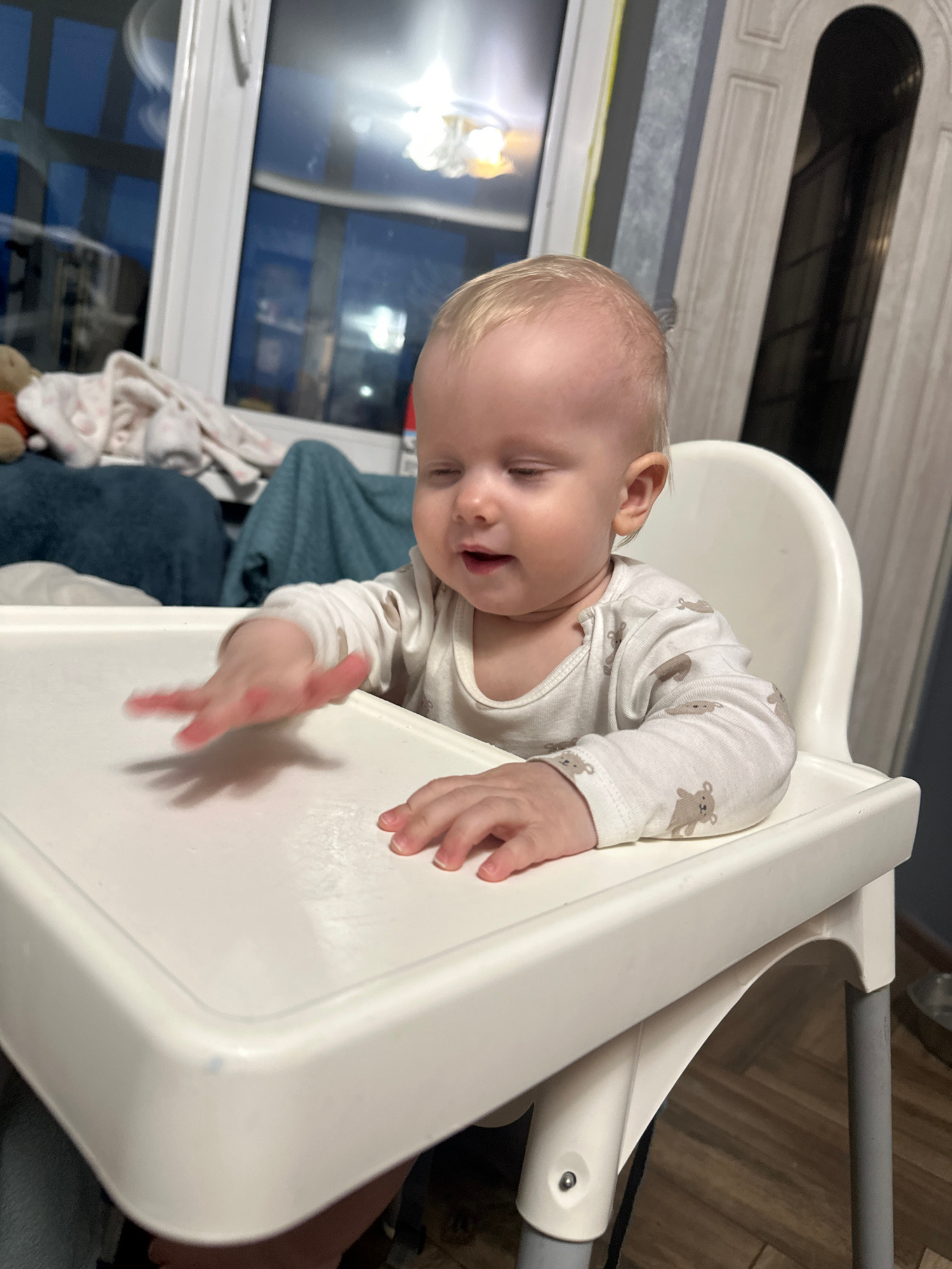 A young child is sitting in a white highchair. The child is wearing a long-sleeved white shirt with small brown bear designs. The child's eyes are closed, and their mouth is slightly open. The child's…read more