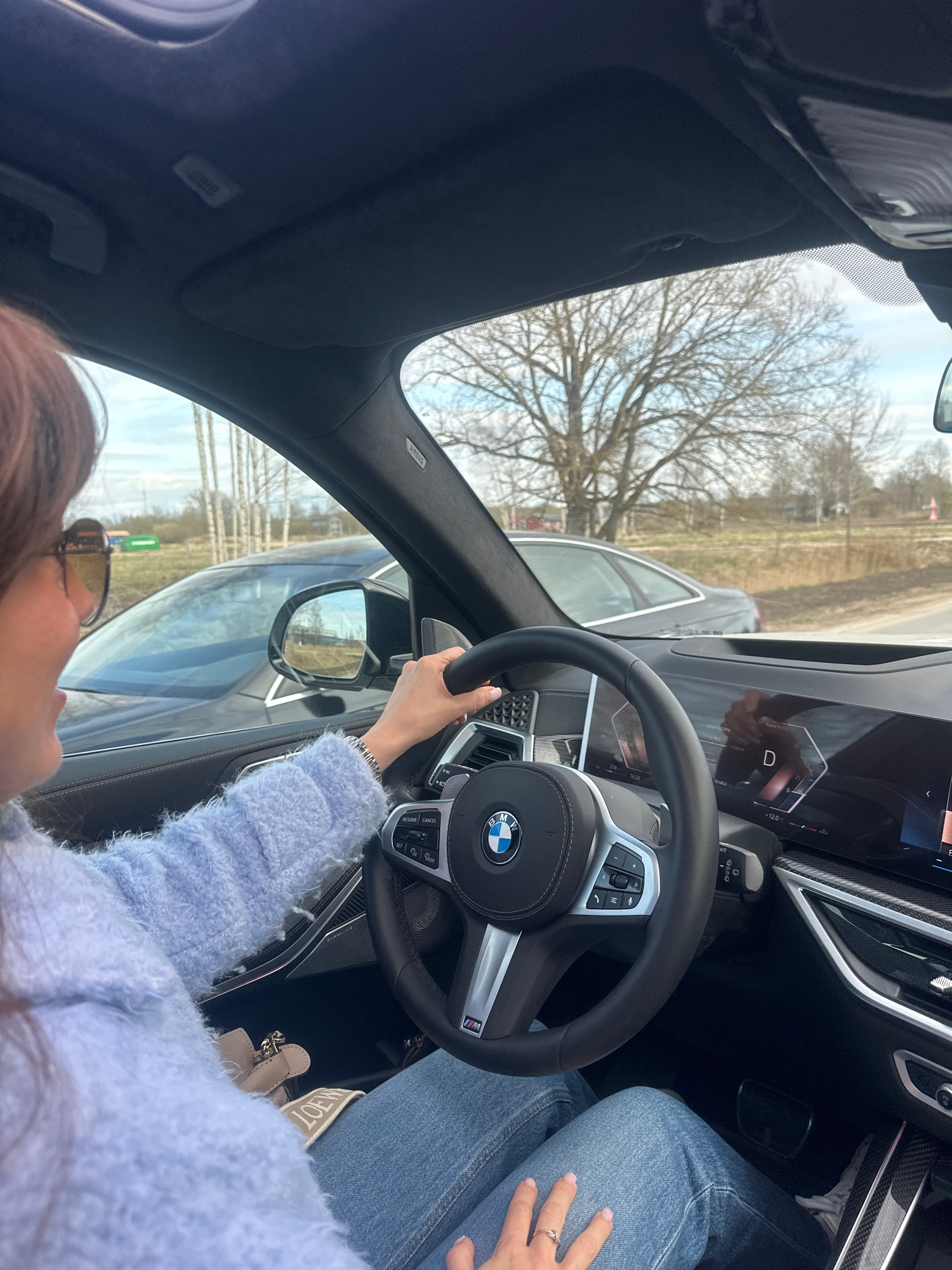 The image is a high-angle, tilted shot from inside the driver's seat of a modern BMW car, looking forward and slightly to the right. A person's right arm and hand are visible, gripping the steering wh…read more