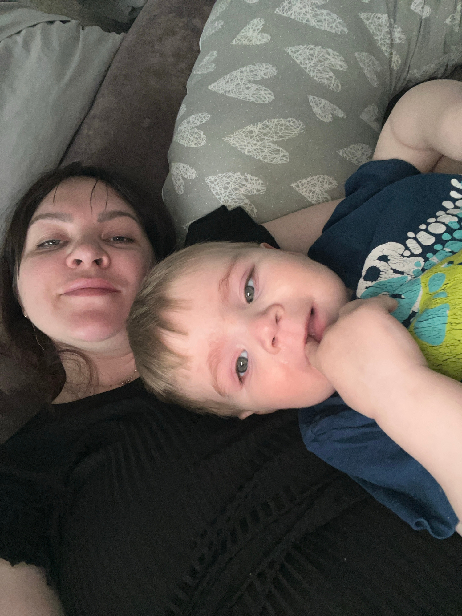 A selfie-style photograph shows a woman and a young child lying down. The woman is at the bottom of the frame, lying on her back, with her face close to the camera. The child is positioned above her,…read more