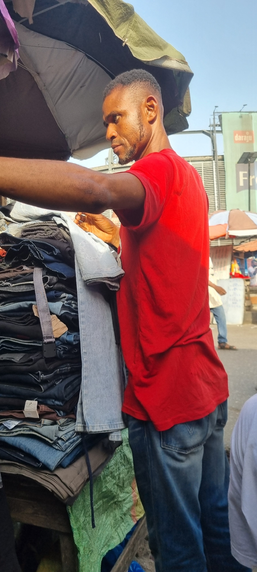 A street vendor in Lagos, Nigeria, stands behind a stack of folded and hanging clothing. He is a dark-skinned man wearing a red shirt and jeans. He is bent forward, looking at the merchandise. The sta…read more