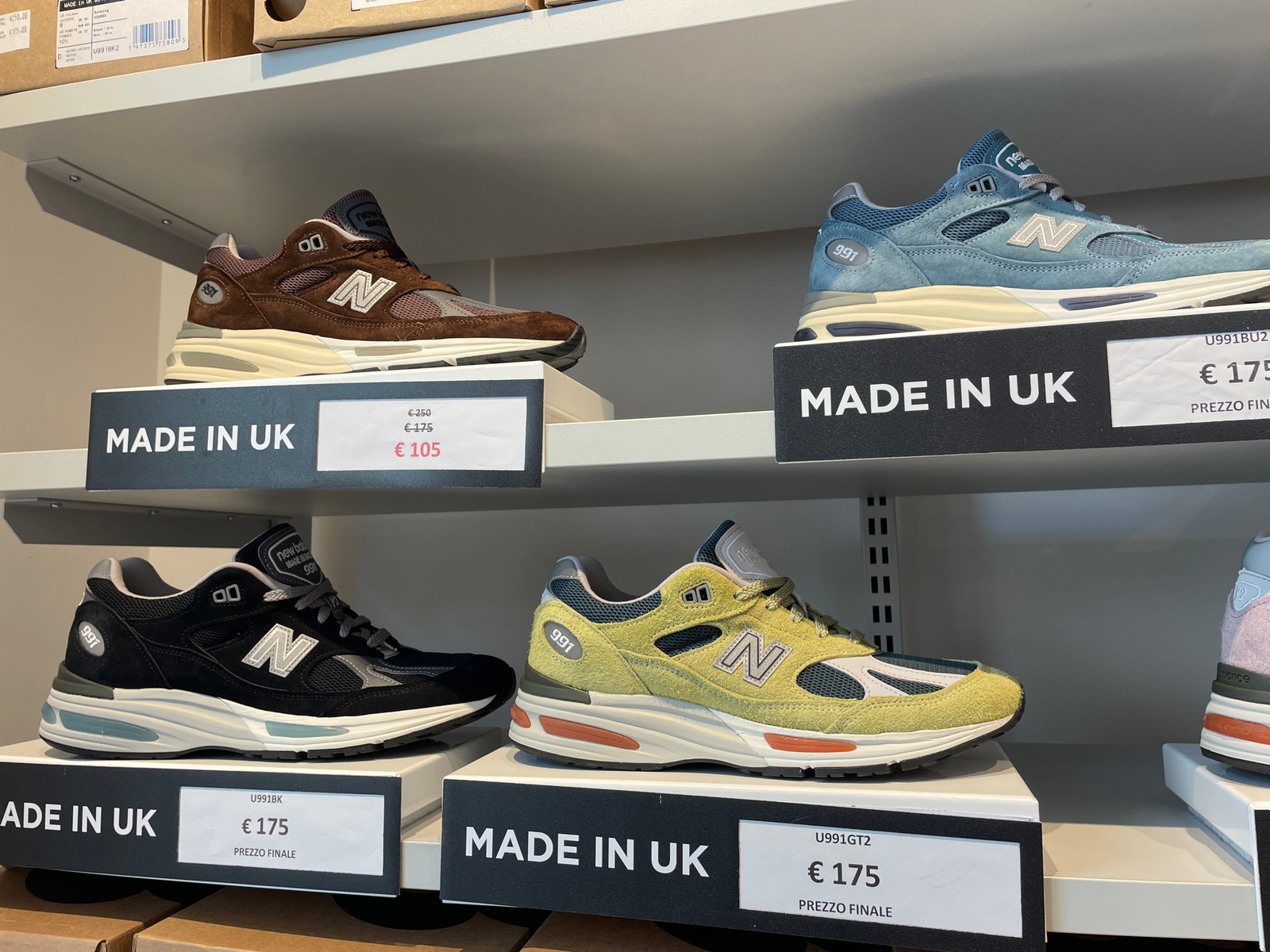 The image captures a retail display of New Balance 991 sneakers, showcasing four distinct colorways on shelves. The shoes are presented with accompanying signage indicating that they are "MADE IN UK"…read more