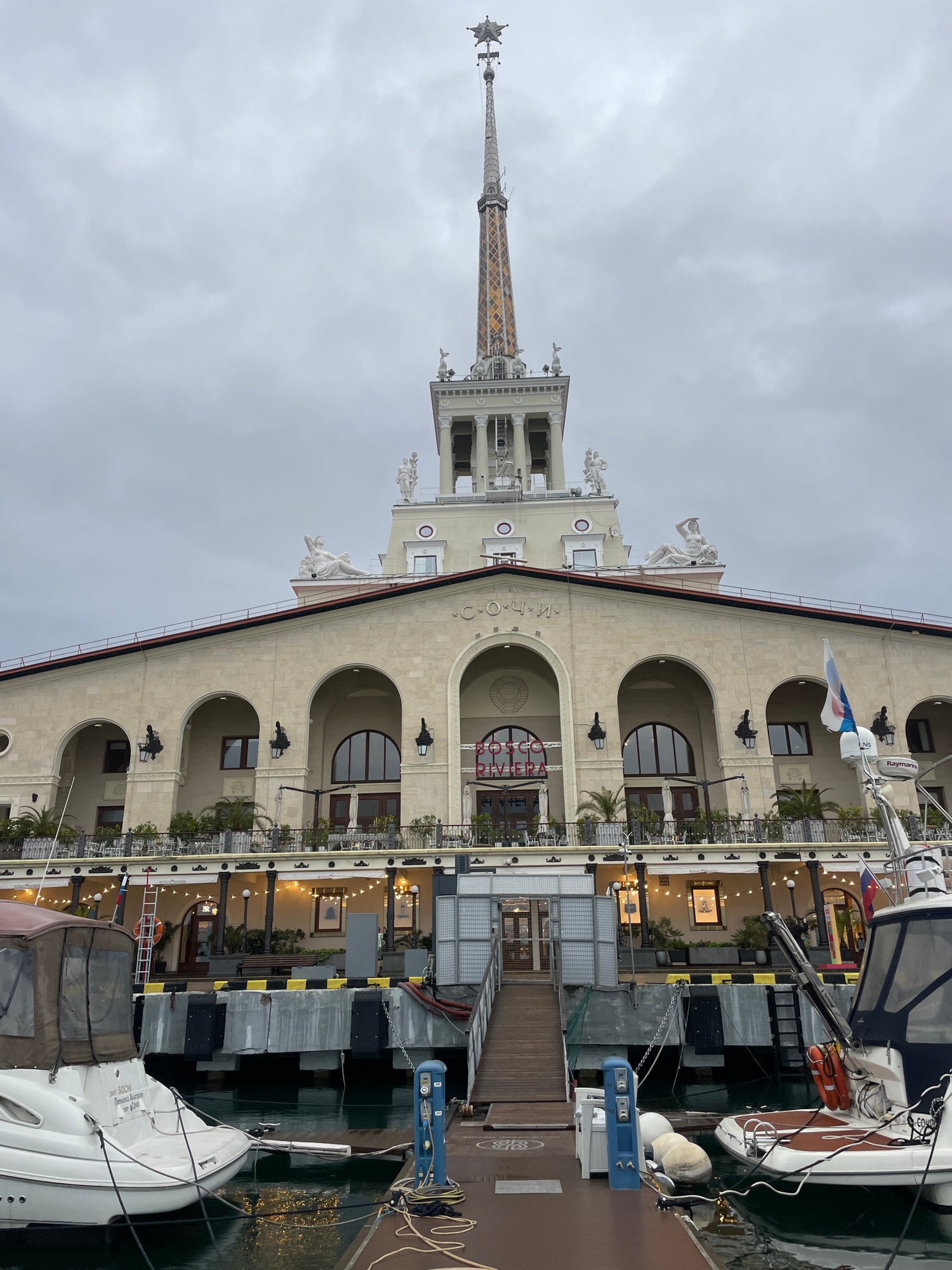 The image depicts the Sochi Sea Port building in Sochi, Russia. The building is a light-colored, multi-story structure with arched windows and a spire. There are several statues on the roof. The building is located next to a marina. Several boats are docked along the marina. The sky is overcast. | Open Wire