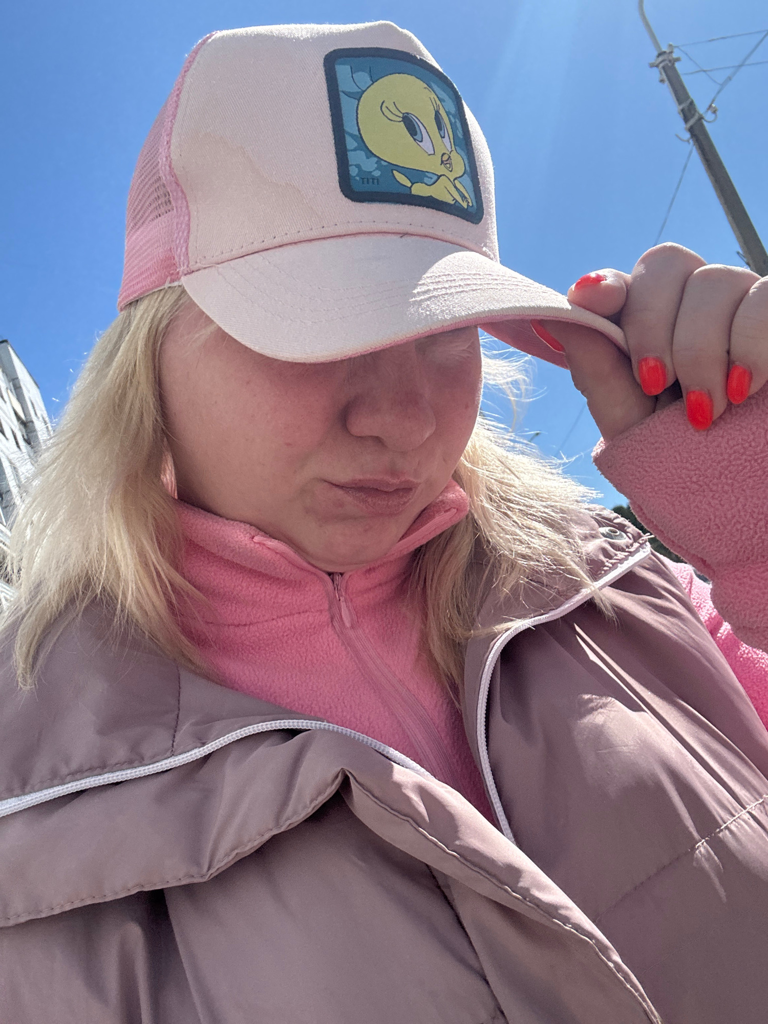 A woman is wearing a pink jacket, pink fleece, and pink trucker hat with Tweety Bird. The photo is an upward angle of the woman's face. The woman has blonde hair and red fingernails. In the background…read more