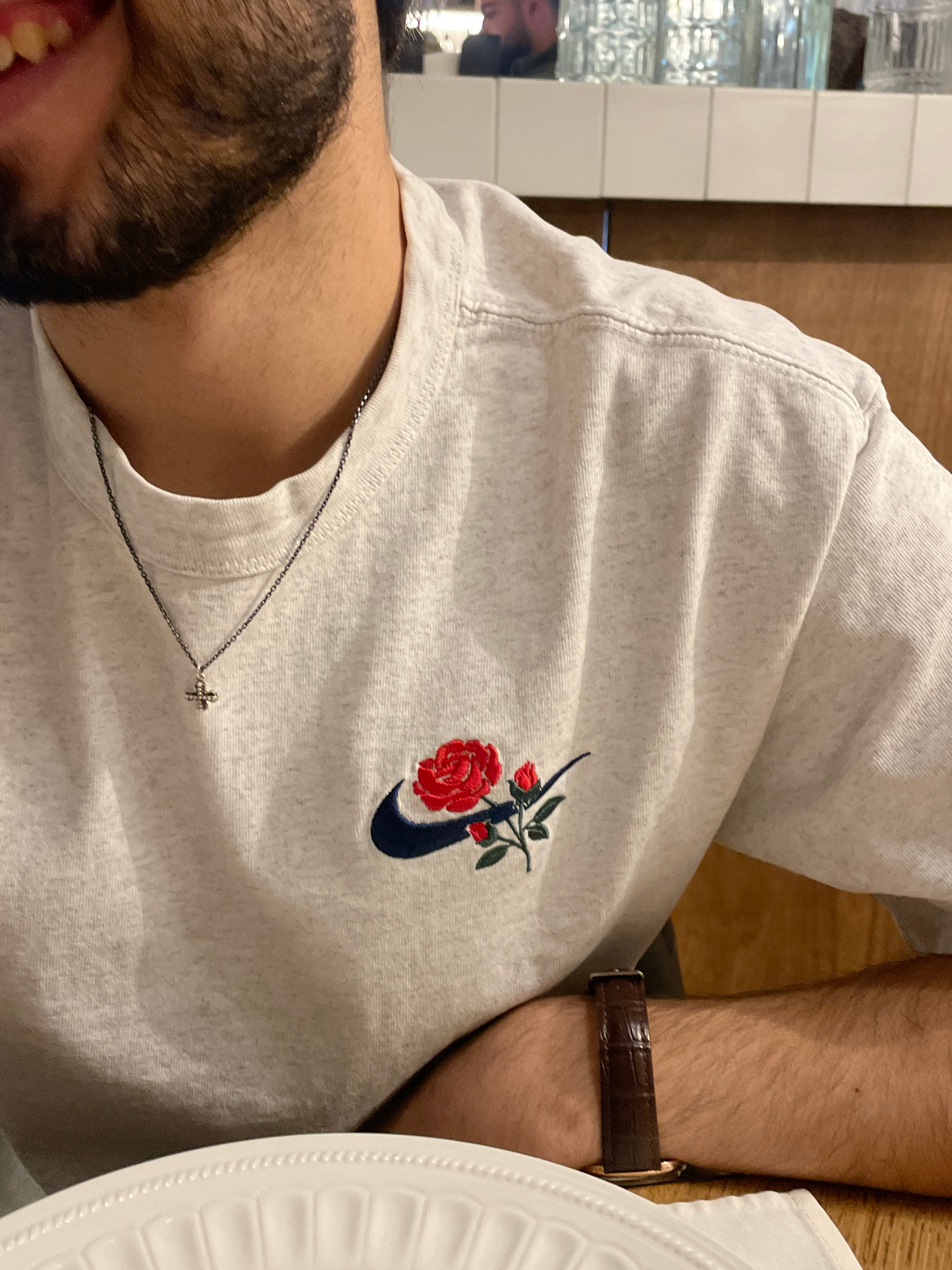 A close-up, indoor shot depicts a portion of a person wearing a light grey sweatshirt with a floral "Nike" logo, along with a silver necklace with a cross pendant. The person has dark hair and a beard…read more
