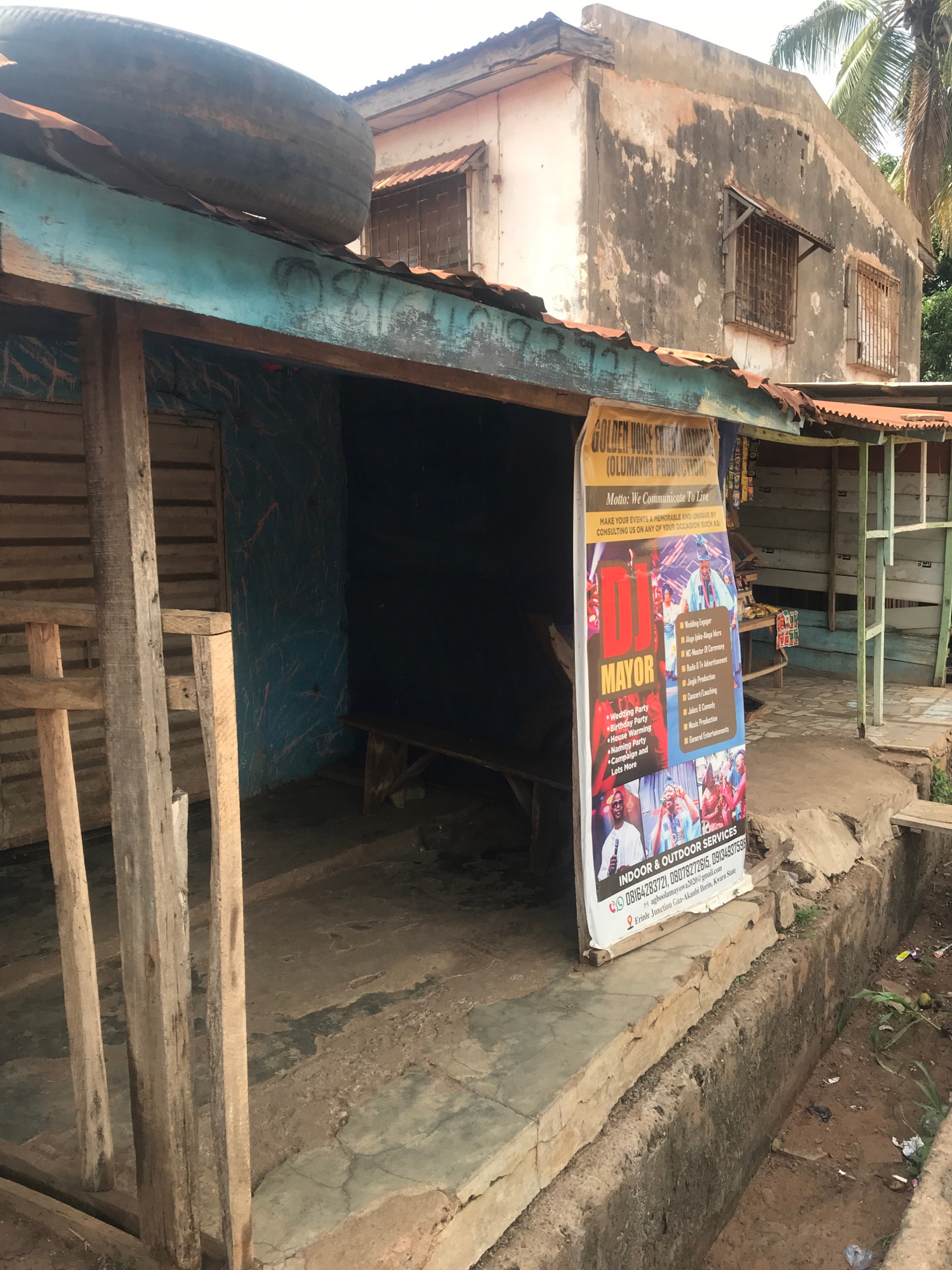An eye-level, medium shot captures a modest business in Erinle Junction, Gaa-Akanbi, Ilorin, Kwara State, Nigeria. The building is worn, with a crumbling, gray facade and barred windows. A faded sign…read more