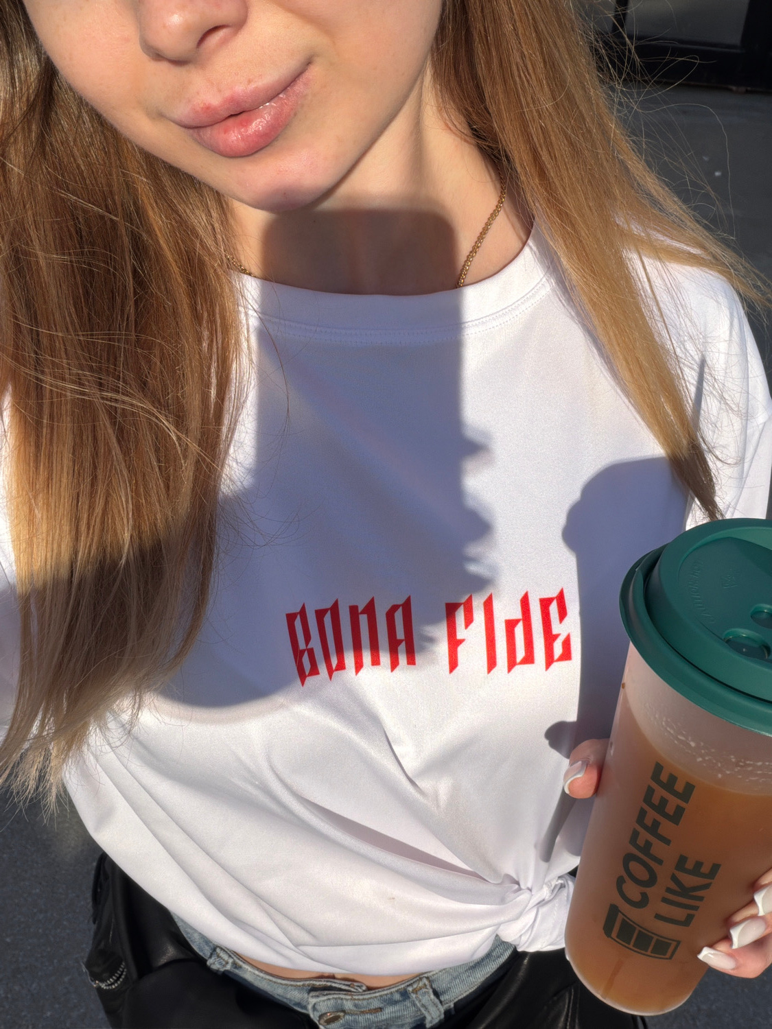 The image displays a close-up, high-angle perspective of a person outdoors on a bright, sunny day in Barnaul, Russia. The individual is seen from the chest up, with their head slightly turned, appeari…read more
