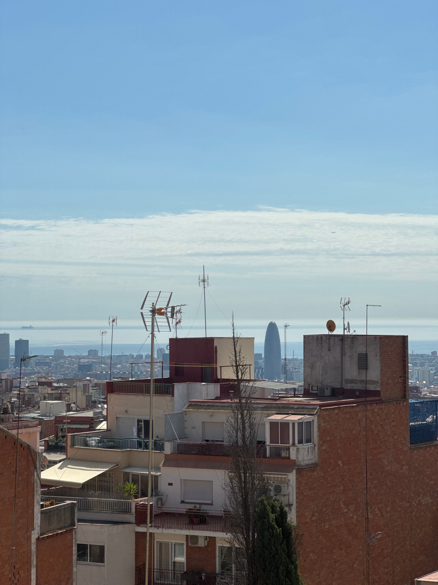 The image depicts a cityscape of Barcelona, Spain. Prominent in the distance is the Agbar Tower, a cylindrical glass structure. The foreground consists of densely packed residential buildings with red…read more