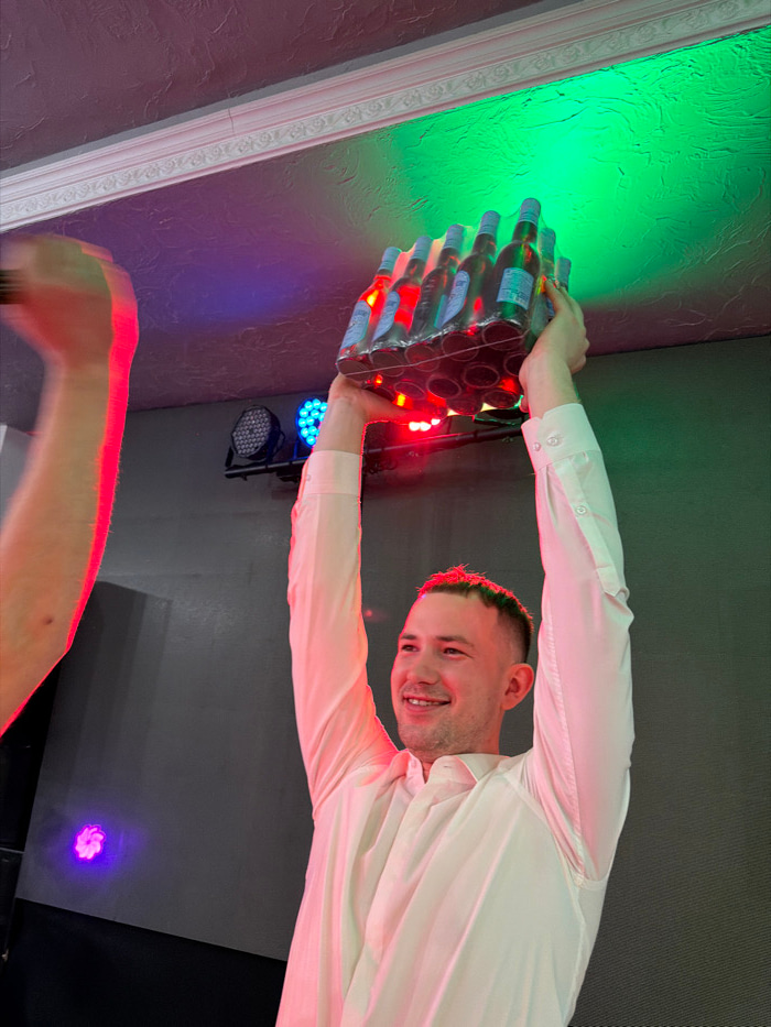 An indoor scene within a club or event venue in Votkinsk, Russia, depicts a male individual, appearing to be in his late 20s or early 30s, with short hair and a white long-sleeved shirt, smiling broadβ¦read more